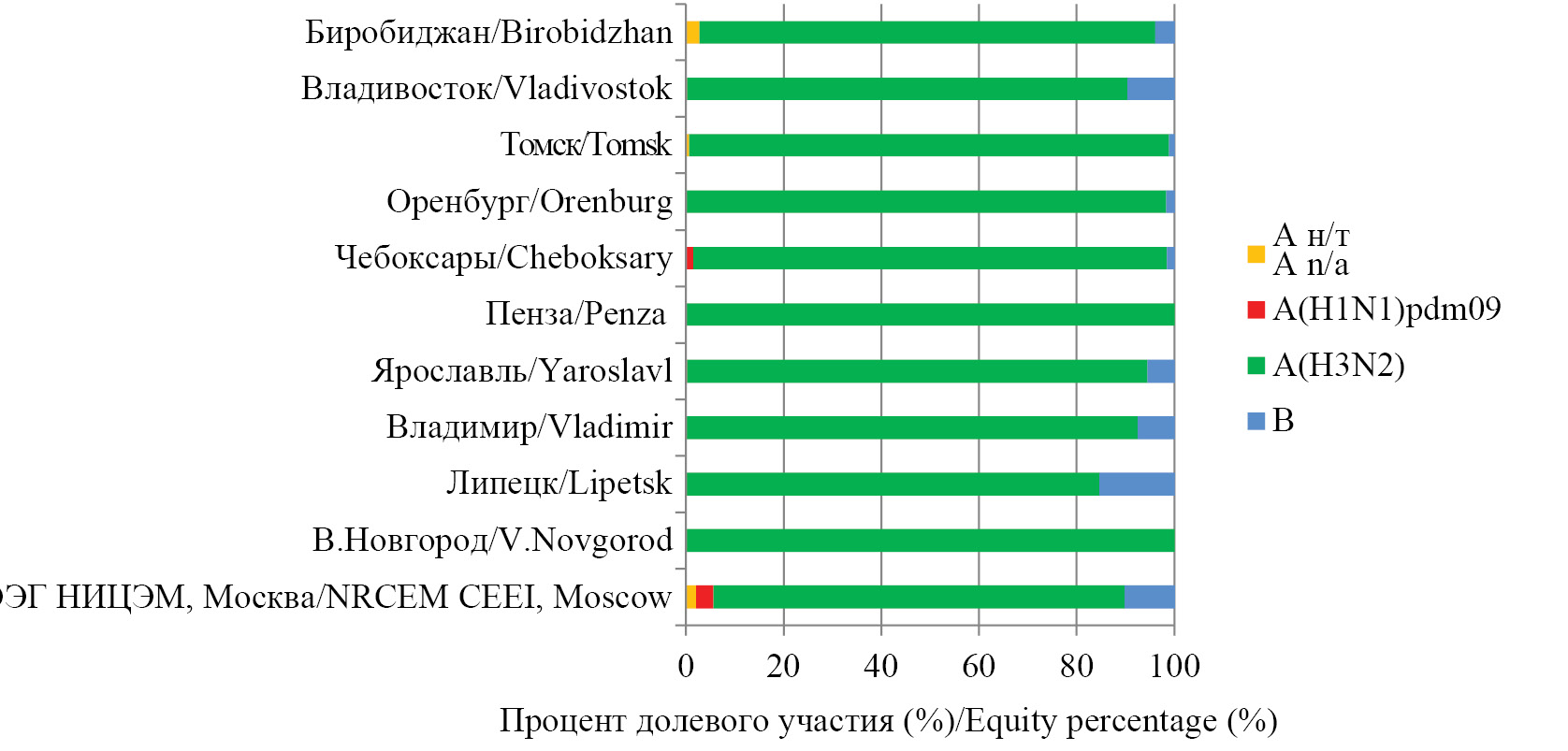At the same time, the regions of Russia did not differ in the proportion of influenza virus types/subtypes (Fig. 2). Influenza A virus dominated in the 2023‒2024 season in all territories cooperating with the NRCEM CEEI. In the structure of influenza A virus, A(H3N2) was most active, with a share of 95.0%. Influenza B virus strains were detected only in 5.0% of cases, while in certain cities its activity was higher compared to other cities in the European part of the Russian Federation: in Moscow (10.3%), Lipetsk (15.3%), Vladimir (7.5%), Yaroslavl (5.5%) and Vladivostok (8.7%).