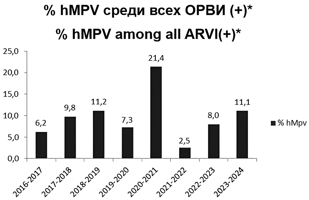 Fig. 1. The percentage of samples positive for metapneumovirus in the structure of acute respiratory viral infections by seasons 2016–2024. * – samples are positive only for respiratory viruses (rhino-, adeno-, boca-, metapneumo-, coronavirus, parainfluenza viruses and human respiratory syncytial virus) excluding influenza viruses and SARS-CoV-2.