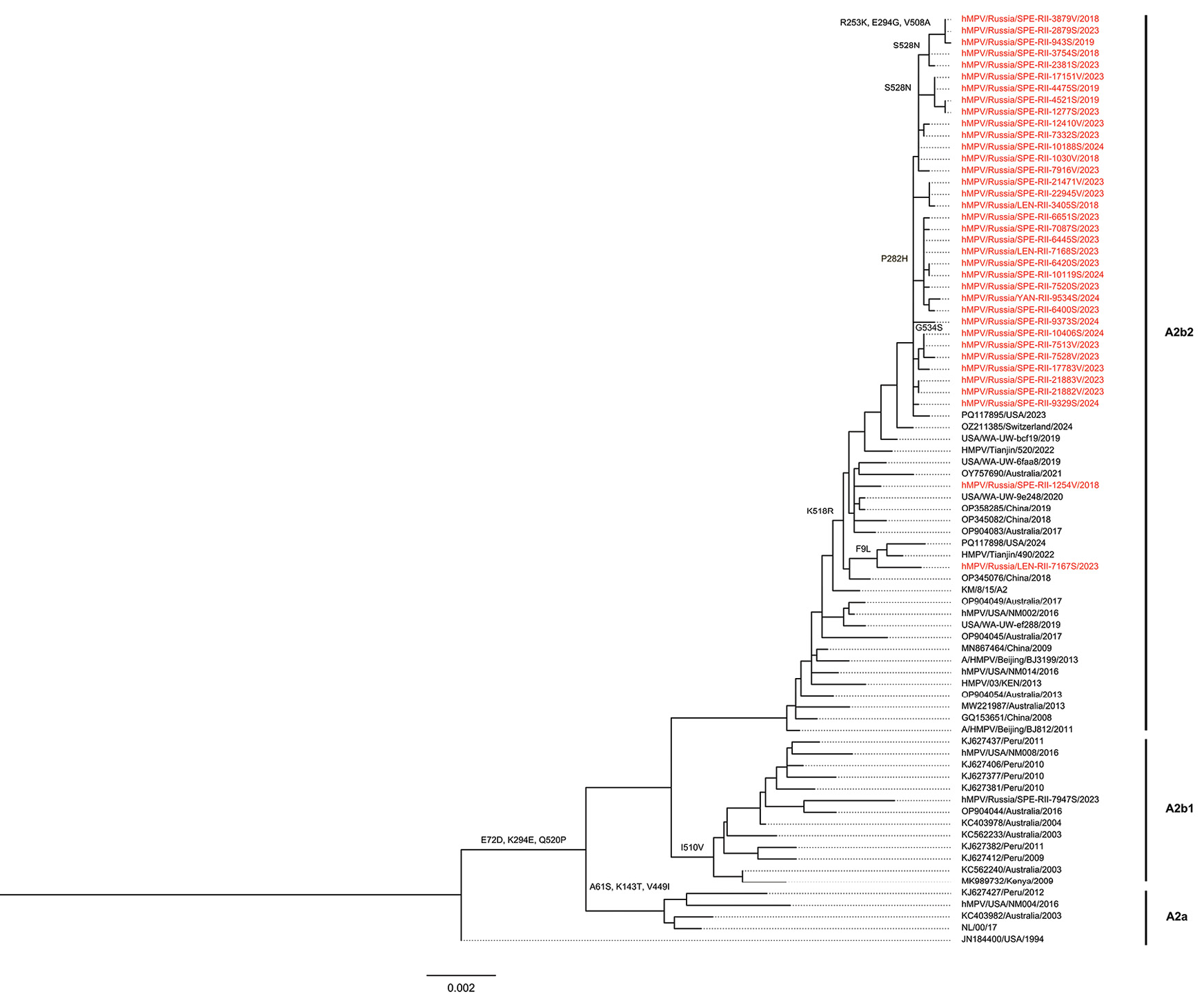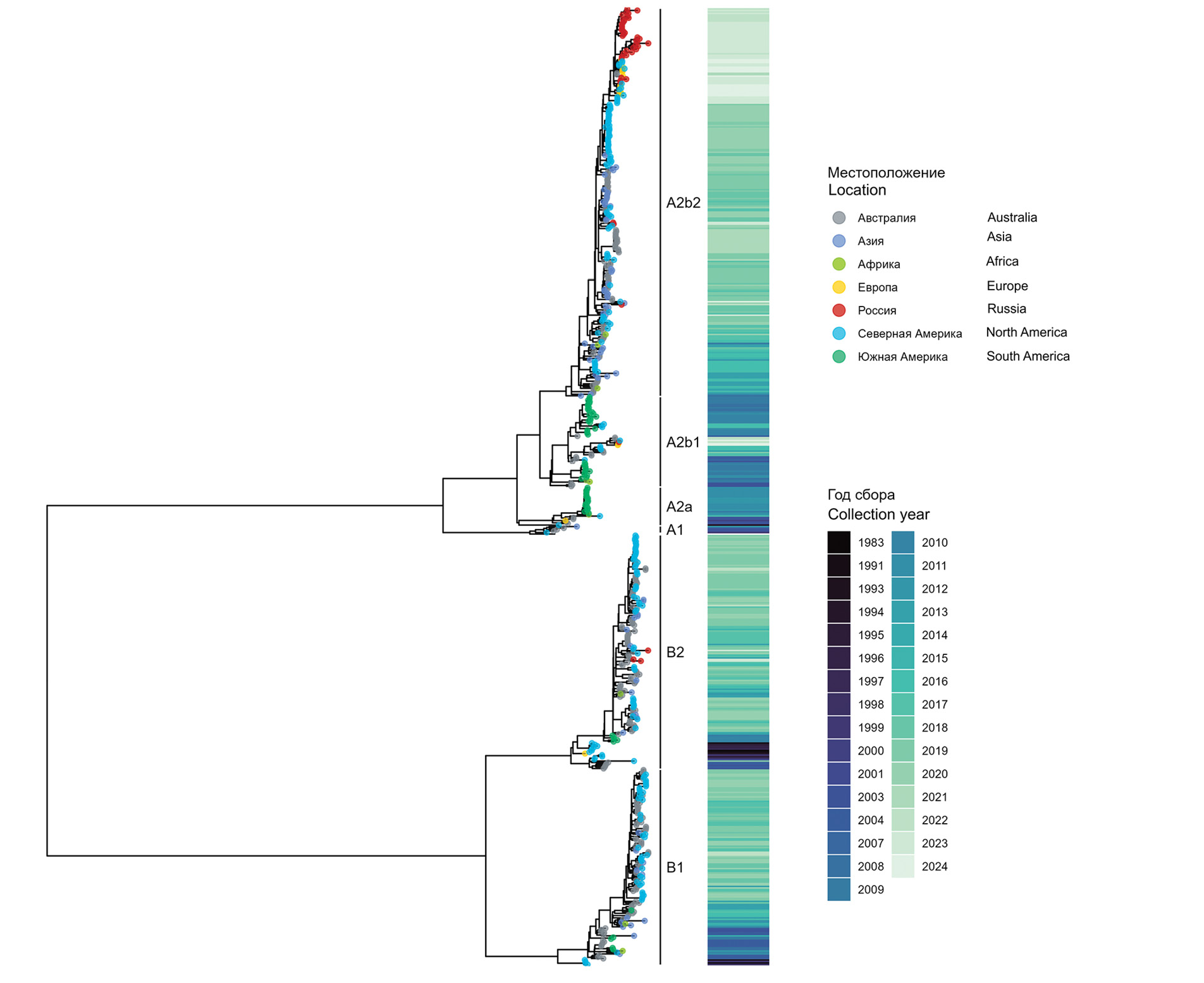 One of the key results of the work was the establishment of the dominance of the A2b2 genetic clade in Russian hMPV isolates in the period from 2017 to 2024.