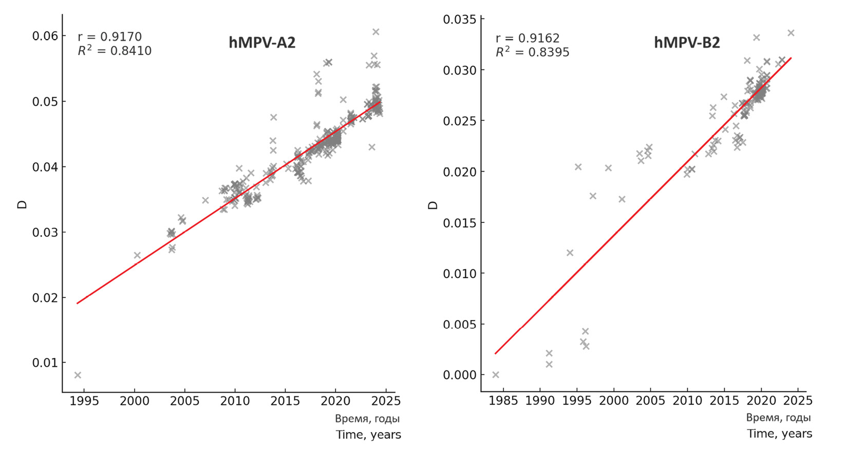 Рис. 3. Определение временно́го сигнала в полногеномных последовательностях hMPV. Субтип A2 (слева), субтип B2 (справа). D – генетическая дистанция от корня до листьев филогенетического дерева (root-to-tip divergence).
