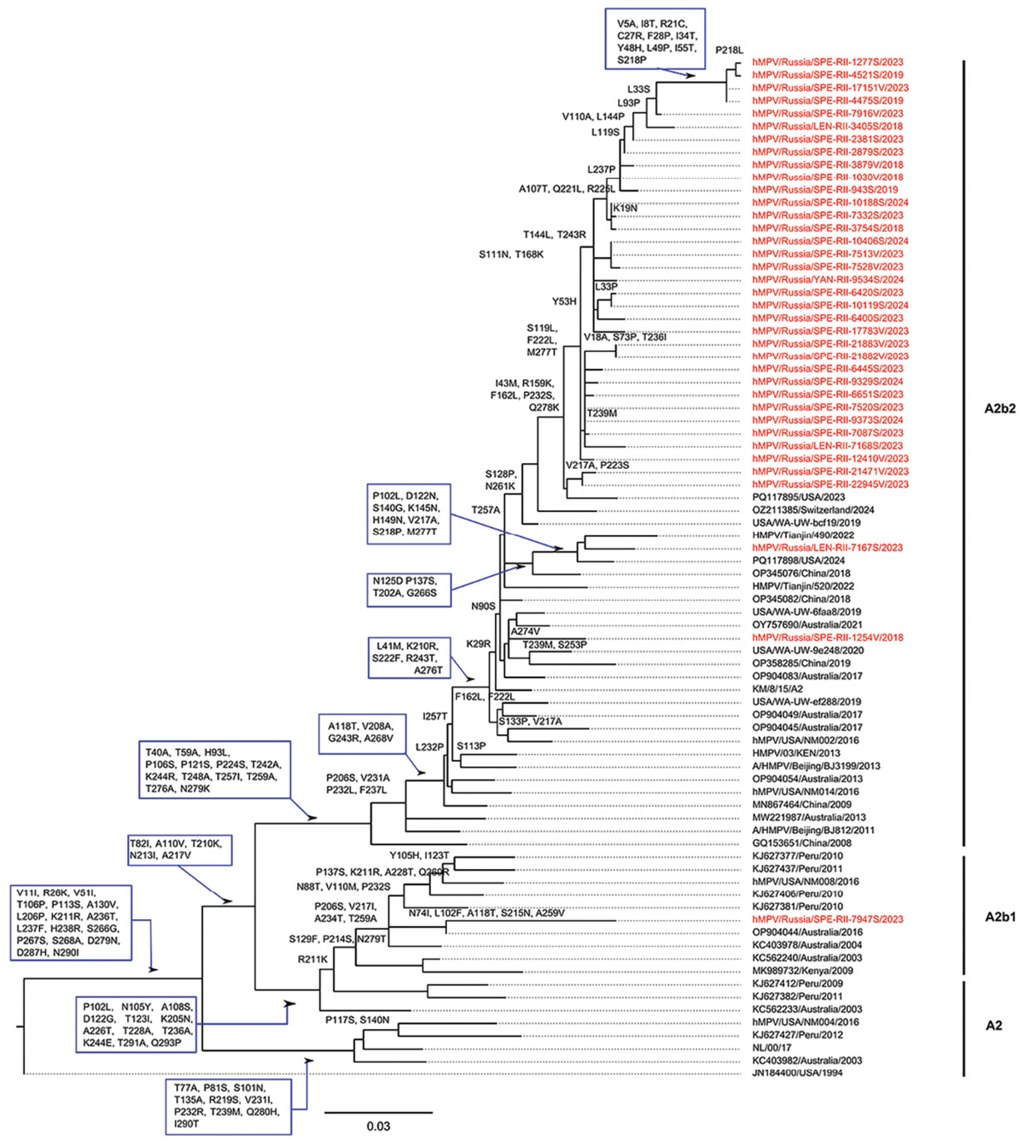 Fig. 2. Global diversity of human metapneumoviruses based on whole-genome sequencing data. Isolates from the Russian Federation are marked in red.