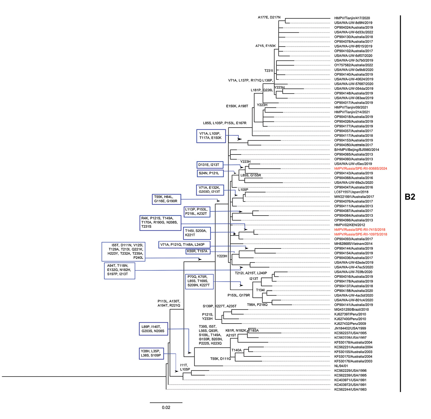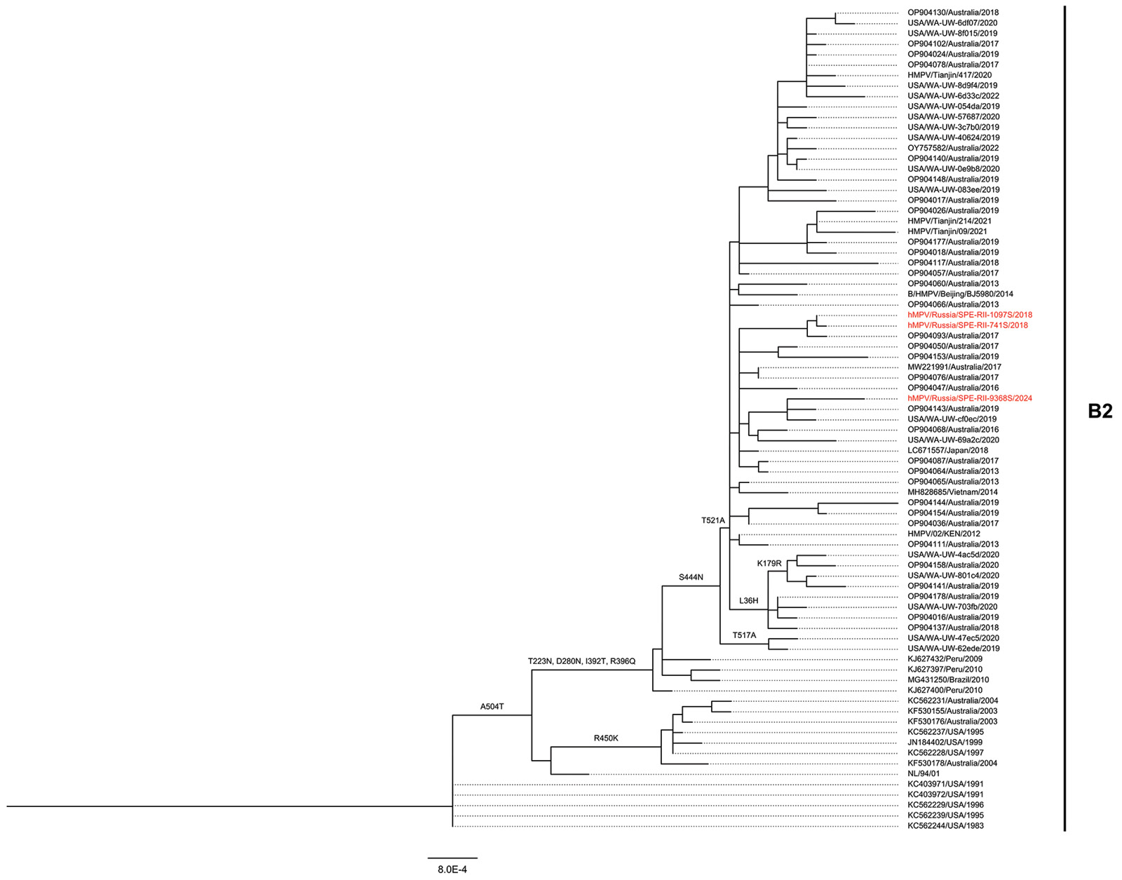 Fig. 6. F gene phylogenetic tree of subtype B2 human metapneumovirus. Viruses identified in Saint Petersburg are marked in red.