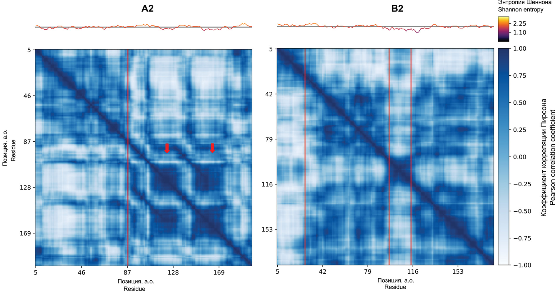 Рис. 8. Тепловая карта внешних доменов белка G вирусов hMPV подтипов A2 (слева) и B2 (справа) по данным инструмента Chi-Score (Brendan S. и соавт., 2023 [31]). Красными стрелками отмечены участки протяженных дупликаций.