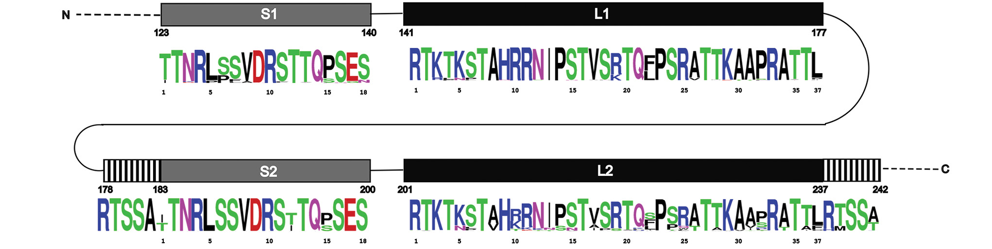 It was shown that the outer domain of the G protein hMPV subtype A2 can be divided into two modules – module 1 (52–139 a.a.r.) and module 2 (140 a.a.r. – C-terminus of the protein), with module 2 characterized by extended duplications (up to 37 a.a.r. in length). The repeats consist of S1, L1, S2, L2 sites separated by conserved RTSSA spacer sequences (Fig. 9). It should be noted that the repeat sites are not 100% homologous and may contain substitutions at different positions.