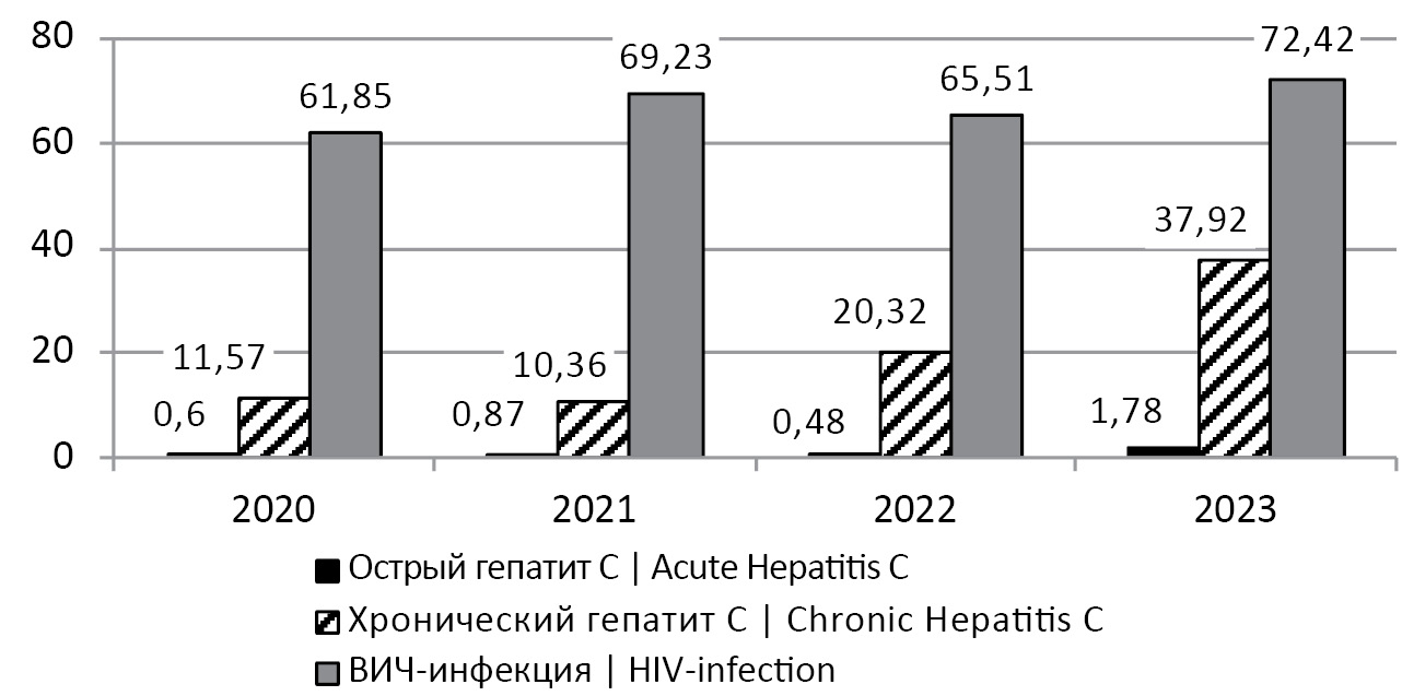 The established insignificant decrease in the incidence of hepatitis C and HIV infection in Altai Krai in 2021–2022 is probably related to the COVID-19 epidemic, in which the self-isolation regime did not allow effective detection of new HIV-1 and HCV infections. In Europe as a whole, there was a decrease in the incidence of HCV infection in 2020–2021: from 6.6 cases per 100,000 population in 2019 to 4.7 per 100,000 population by 2021. However, this rate once again increased to 6.5 per 100,000 population in 2022 [1]. Thus, and in Altai Krai, an increase in the incidence of acute and chronic hepatitis C was registered in 2023: up to 1.78 and 37.92 per 100 thousand population, respectively (Fig. 1).