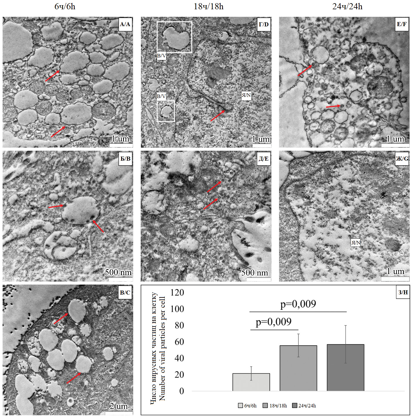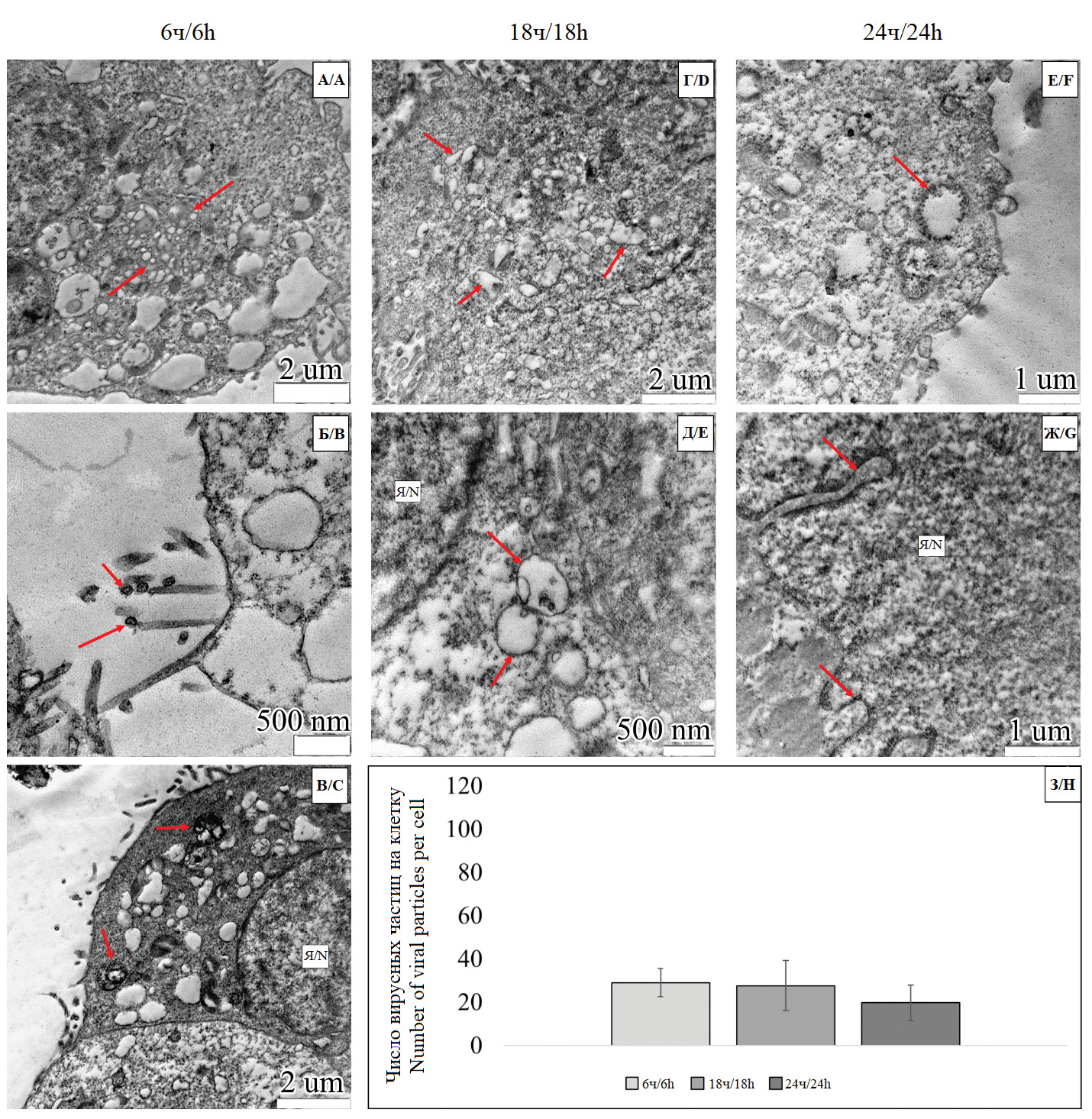 А – участок цитоплазмы клетки, демонстрирующий высокую синтетическую активность: видны множественные просветы аппарата Гольджи и грЭПР (стрелки), местами с признаками вакуолизации. Масштаб 2 мкм; Б – фрагмент мембраны с микроворсинками и вирусными частицами в состоянии адгезии (стрелки). Масштаб 500 нм; В – участки двух соседних клеток. Клетка в верхней половине электронограммы имеет сравнительно более плотную гиалоплазму, в которой локализованы везикулы, содержащие электронно-плотное вещество (стрелка). Я – ядро. Масштаб 2 мкм; Г – участок цитоплазмы клетки с высокой синтетической активностью, выраженной в вакуолизации профилей ЭПР (стрелки). Масштаб 2 мкм; Д – участок гиалоплазмы клетки, с вируссодержащими транспортными везикулами (стрелки) вблизи ядра (N). Масштаб 500 нм; Е – фрагмент цитоплазмы клетки с вирусными частицами, локализованными вдоль внутренней стороны везикулярной мембраны (стрелка). Масштаб 1 мкм; Ж – участок клеточного ядра (N) с признаками инвагинации ядерных мембран (стрелка). Масштаб 1 мкм; З – график типа «Bar-plot», отражающий динамику изменения количества вирусных частиц на клетку на этапах 6, 18 и 24 ч.