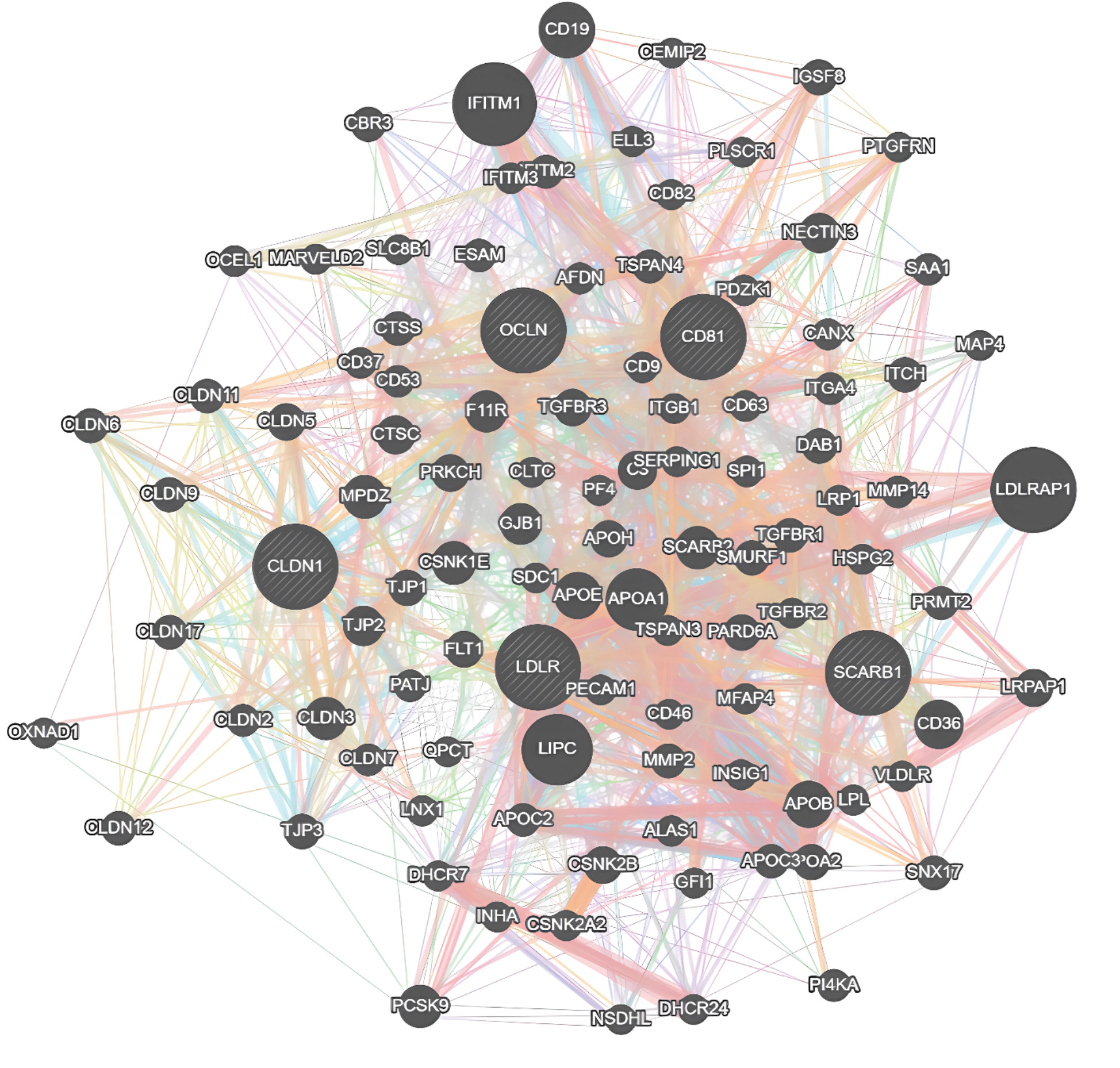 The majority of the candidate genes belong to the families of apolipoproteins, tight junction proteins and immune regulators, with additional contributions to endocytosis and signal transduction. During the analysis of genetic and protein-protein networks, the pathways between the identified genes were cut. As a result, 98 genes were found to be potentially significant according to STRING.