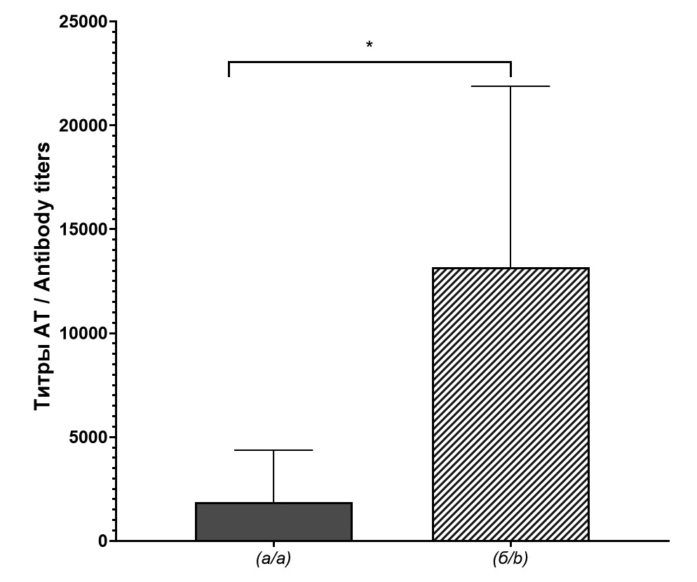 3. Fig. 2. Titers of total antibodies in mice immunized with recombinant VP1 protein in the absence (a) and presence (b) of aluminium hydroxide. * – statistically significant differences (p < 0.05).