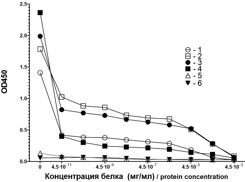 1 – total AB after immunization without adjuvant; 2 – same with adjuvant; 3 – IgM AB after immunization without adjuvant; 4 – same with adjuvant; 5 – total AB of unimmunized mice; 6 – IgM-AB of unimmunized mice.