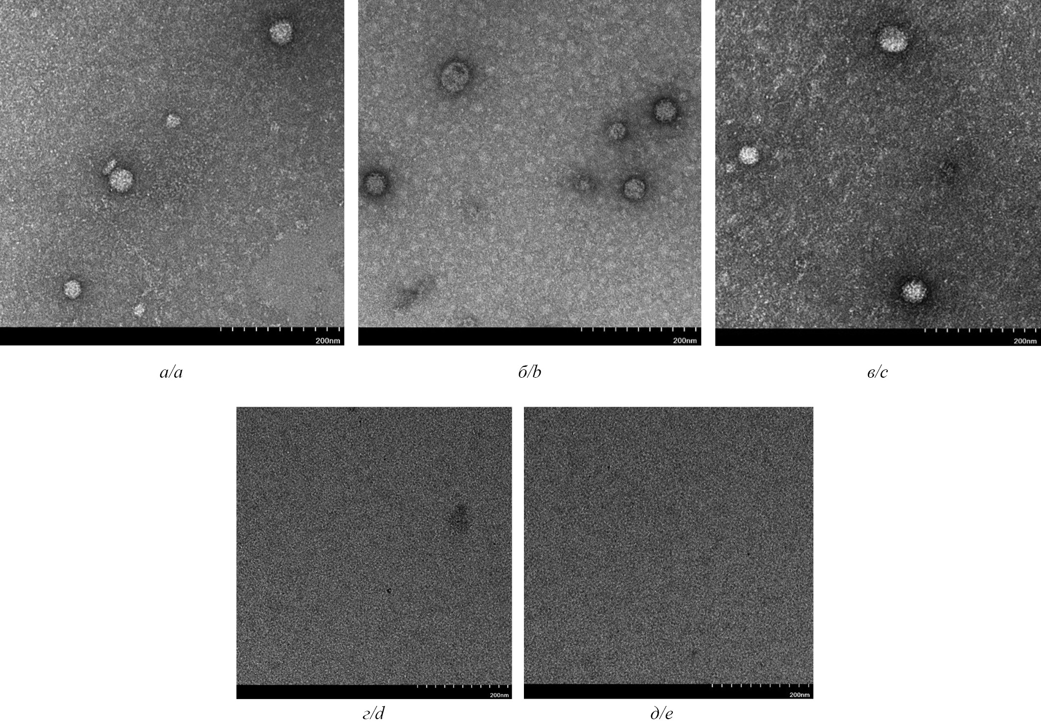 6. Fig. 5. Electron micrographs of norovirus particles interacting with antibodies against norovirus VP1 protein. a – norovirus (NoV) genotype GII.4; b – NoV genotype GII.17. c – NoV genotype GII.7; d – GI.3; e – Echovirus 30.