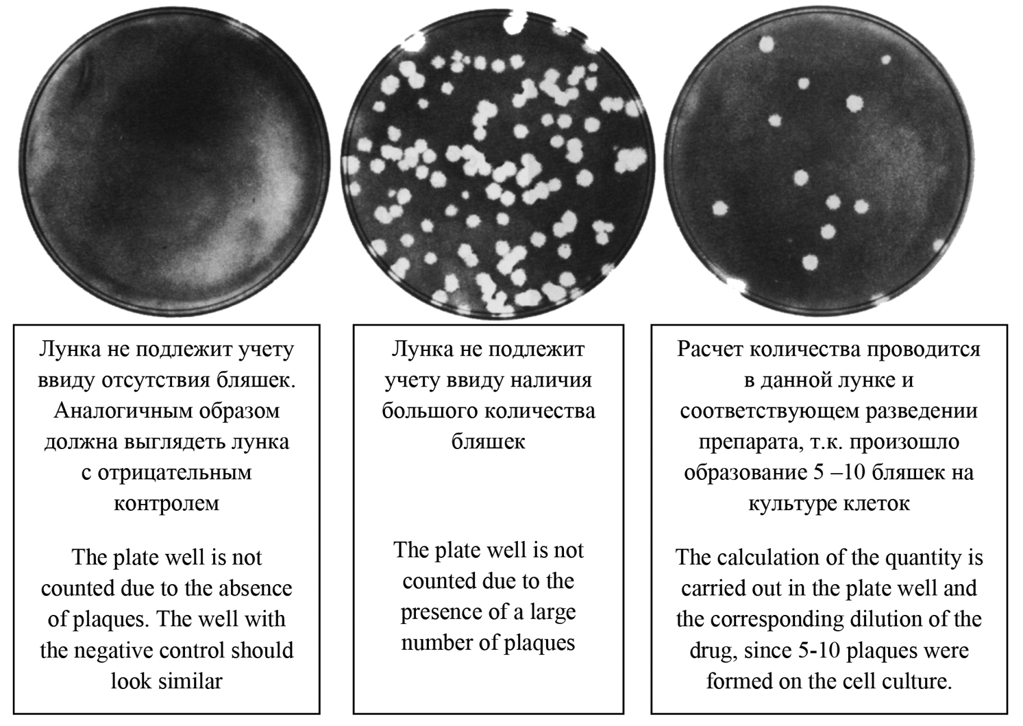 При расчетах учитывали разведения препарата, в котором происходило образование не менее 5–10 бляшек на монослое клеток.