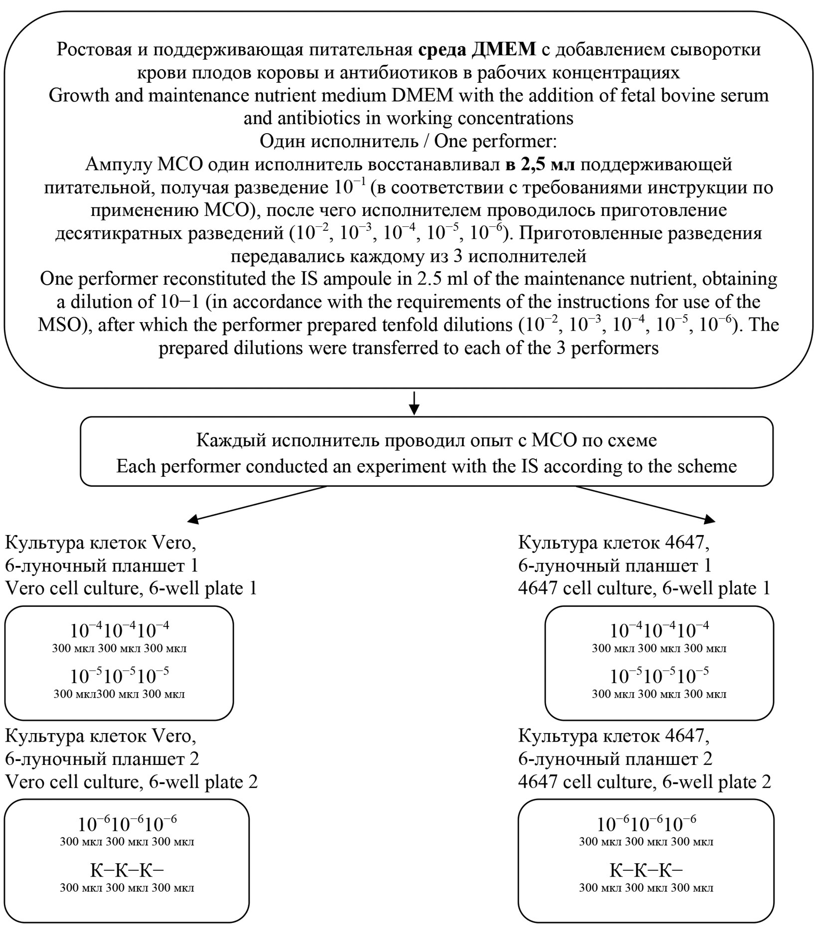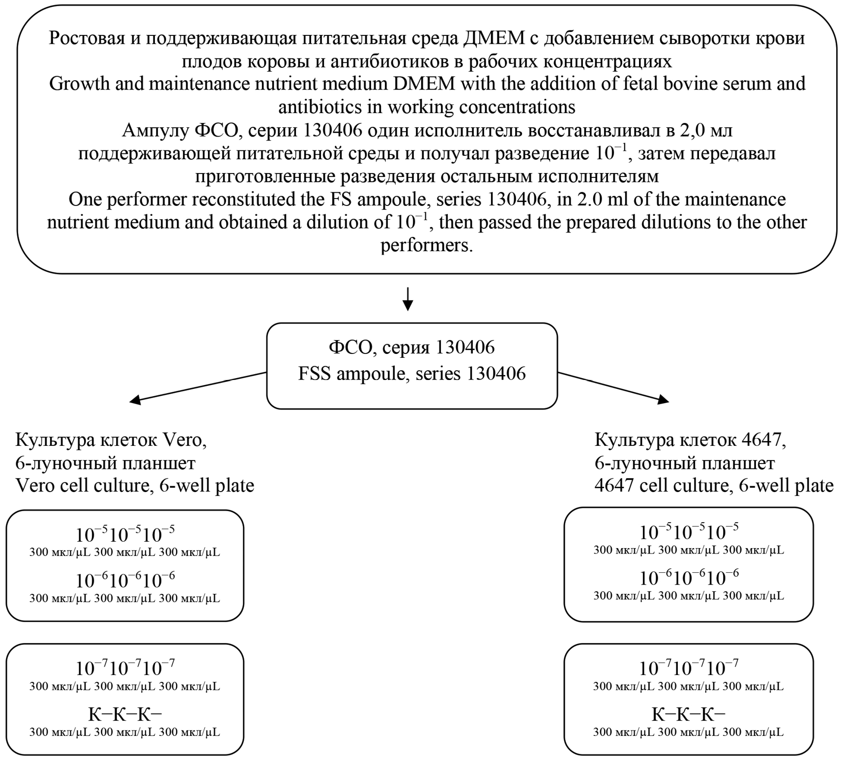 Предварительное исследование проводилось каждым из 3 исполнителей. В качестве ростовой и поддерживающей питательных сред была использована среда Игла МЕМ с двойным набором аминокислот и стабильным L-глутамином с добавлением сыворотки крови плодов коровы и антибиотиков в рабочих концентрациях на двух культурах клеток Vero и 4647. Испытанию подвергались образцы ФСО ГФ РФ 3.2.00113. Каждую из ампул исследуемых образцов исполнитель растворял в 2,0 мл поддерживающей питательной среды для получения разведения 101, после чего проводил приготовление последовательных 10-кратных разведений в соответствии с требованиями ГФ РФ, ФС.3.3.1.0033.15 Вакцина оспенная живая, раздел «специфическая активность».