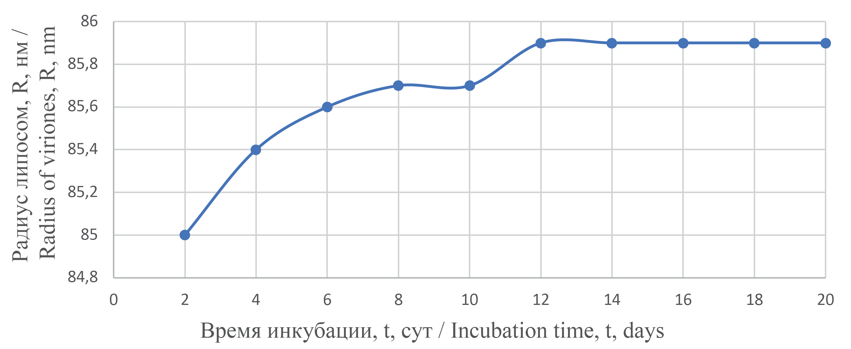 Объектом исследования служил штамм вируса гриппа птиц А/Маллард Пенсильвания/10218/84 (H5N2). Вирус выращивали на 10-дневных куриных эмбрионах. Исходный инфекционный титр вируса составлял 7,0 ± 0,2 lg 50% эмбриональных инфицирующих доз в 1 мл (ЭИД50/мл). Изучение противовирусного действия вируса проводили в перевиваемой культуре клеток MDCK (клетки почек собаки Мадина–Дарби). Клетки линии MDCK высевали на 24-луночные планшеты и инкубировали 14–24 ч до формирования монослоя, занимающего от 80 до 90% ростовой поверхности. Затем вносили в лунки по 0,1 мл вируссодержащей жидкости (множественность инфекции составляла 0,01 ТЦД50/кл (50% тканевая цитопатическая доза на клетку)) в среде альфа-МЕМ и инкубировали в течение 72 ч в атмосфере СО2 при 36 °С. После инкубации клетки промывали средой МЕМ и вносили бесхолестериновые липосомы в лунки планшетов с монослоем клеток в объеме 0,5 мл. Планшеты с клетками инкубировали в атмосфере СО2 при 36 °С в течение 30 мин. Затем в культуральной жидкости определяли инфекционный и гемагглютинирующий титр вируса. Инфекционность вируса определяли по титрованию в 10-дневных куриных эмбрионах при их заражении в аллантоисную полость. Инфекционный титр рассчитывали по методу Рида–Менча. Реакцию гемагглютинации проводили стандартным образом с использованием куриных эритроцитов [10]. Исходный гемагглютинирующий титр составлял 2048 ГАЕ/мл. Липосомы получали по стандартному методу с незначительными модификациями [11]. Препарат фосфатидилхолина (Sigma, США) в концентрации 1–2 мг/мл в растворе 0,01 М KCl инкубировали при 70 °С в течение 10 мин, также использовали препараты смеси фосфатидилэтаноламина и фосфатидилхолина (Sigma, США) в мольном соотношении 2 : 1. Размеры и частичную концентрацию липосом определяли спектрофотометрически с помощью фотоэлектроколориметра (ФЭК) по методу Геллера [12]. Для стабилизации липосом добавляли полиэтиленгликоль 6000 (Sigma, США) в конечной концентрации 2,5 мМ. Распределение липосом из смеси фосфолипидов по размерам представляло собой гамма-распределение со средним радиусом липосом –R = 85 ± 2,5 нм, средний индекс полидисперности липосомальных дисперсий составлял менее 0,1. Средняя частичная концентрация липосом из смеси фосфолипидов составила ––N = (6,45 ± 0,1) × 1015 см3. Определение степени окисленности липосом проводили по общепринятой методике с расчетом индекса окисленности (ИО):