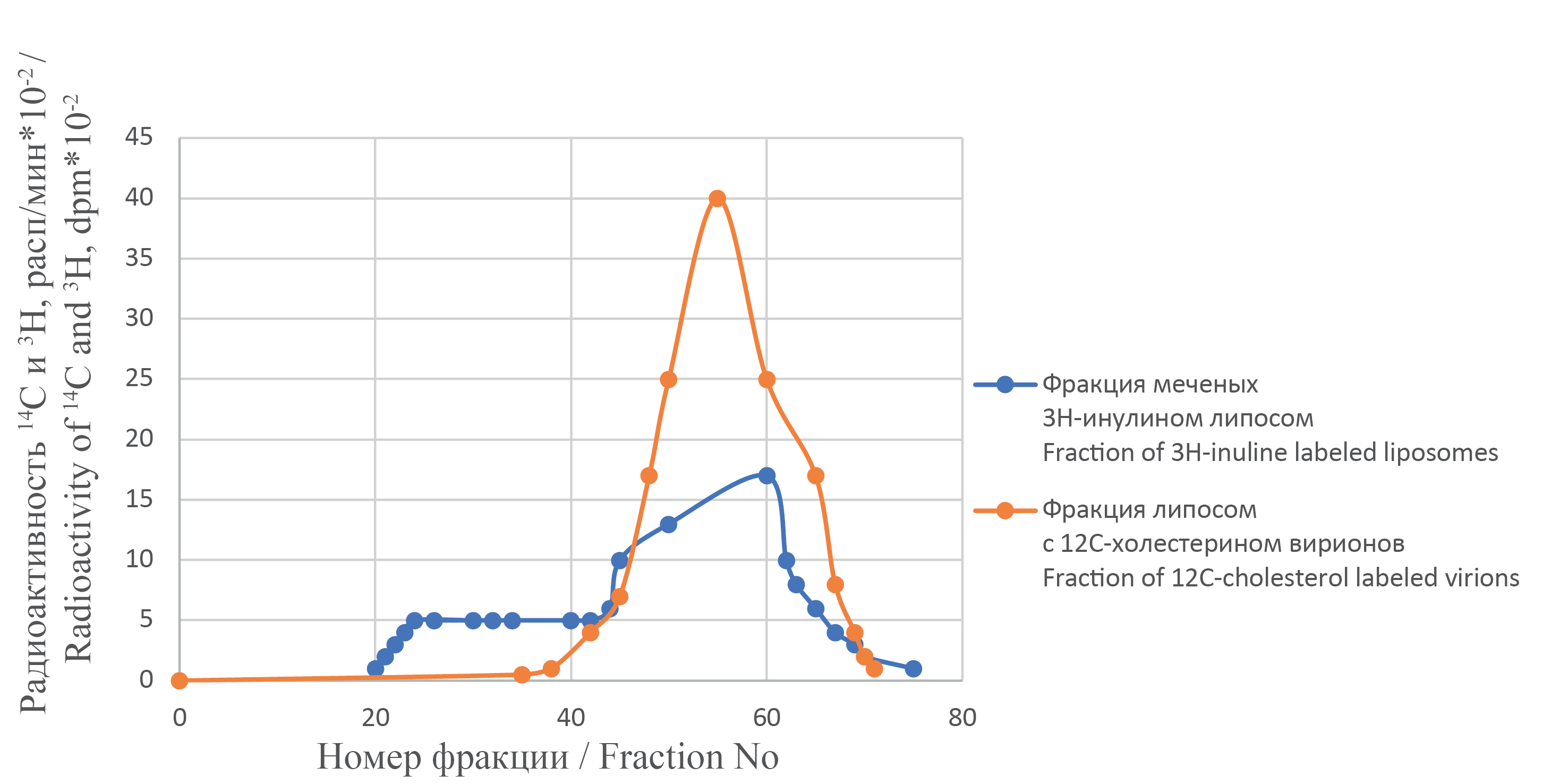 Рис. 2. Гель-фильтрация радиоактивно меченых 3Н-инулином липосом без холестерина и 14С-холестерином вирионов гриппа.