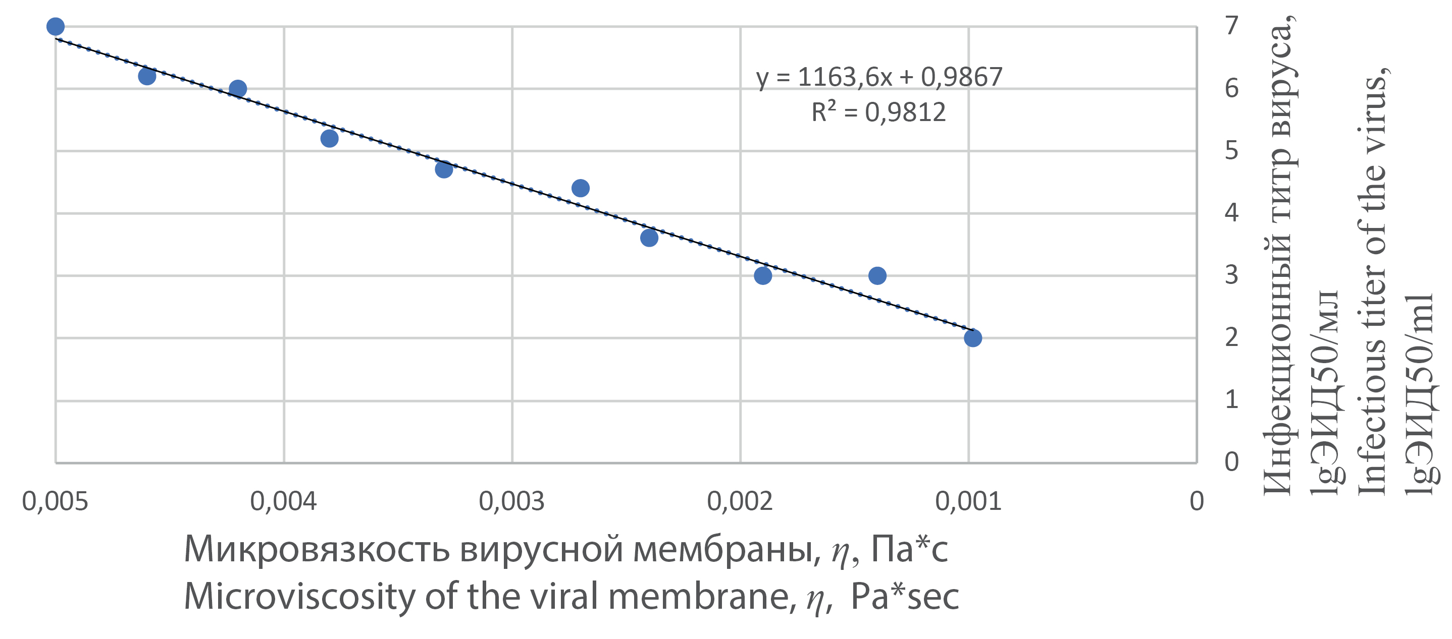Рис. 3. Зависимость инфекционного титра вируса от микровязкости вирусной мембраны.