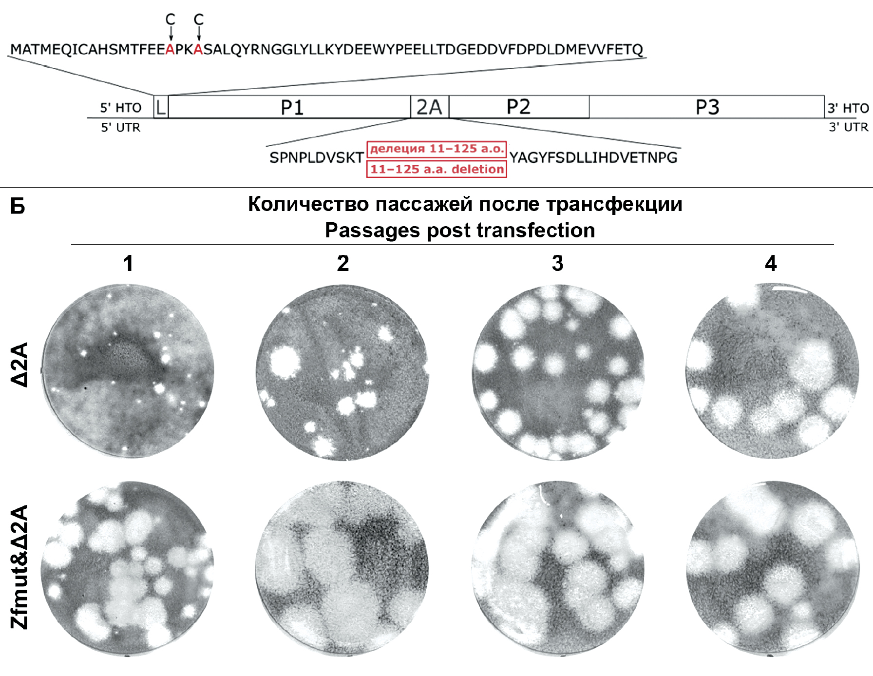 Рис. 1. Схема мутаций, внесенных в последовательность белков L и 2А вируса EMCV-1 для получения мутантных вирусов Zfmut, Δ2A и Zfmut&Δ2A (а); изменение фенотипа негативных колоний полученных мутантных вирусов Δ2A и Zfmut&Δ2A в ходе проведе- ния пассажей на культуре клеток BHK-21 (б).
