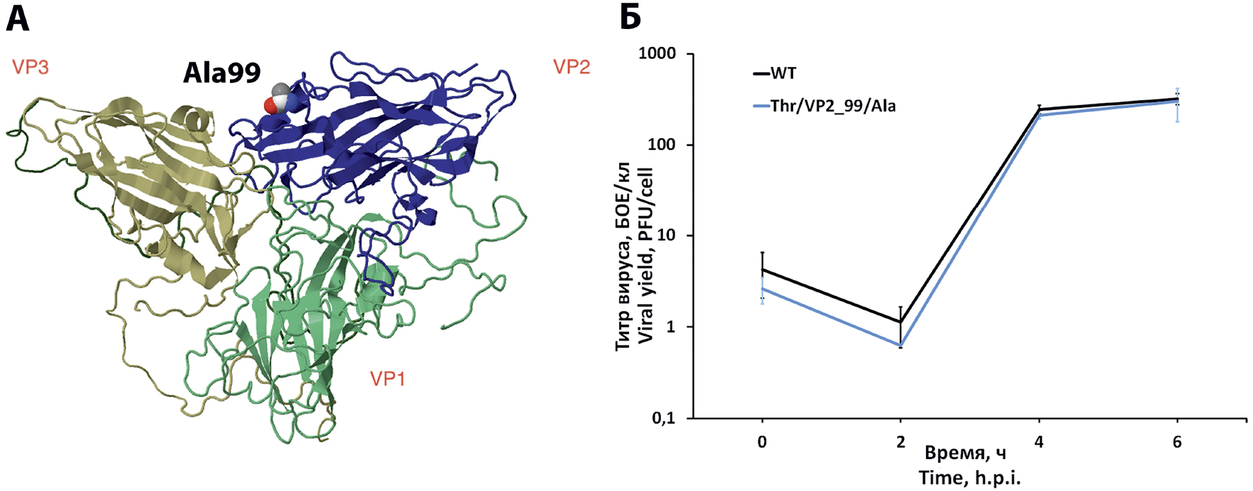 Рис. 2. Положение аминокислотного остатка в позиции № 99 белка VP2 (а); сравнение циклов репродукции EMCV-1 дикого типа (WT) и мутантного вируса с аминокислотной заменой треонина на аланин в положении 99 белка VP2 (Thr/VP2_99/Ala) (б).