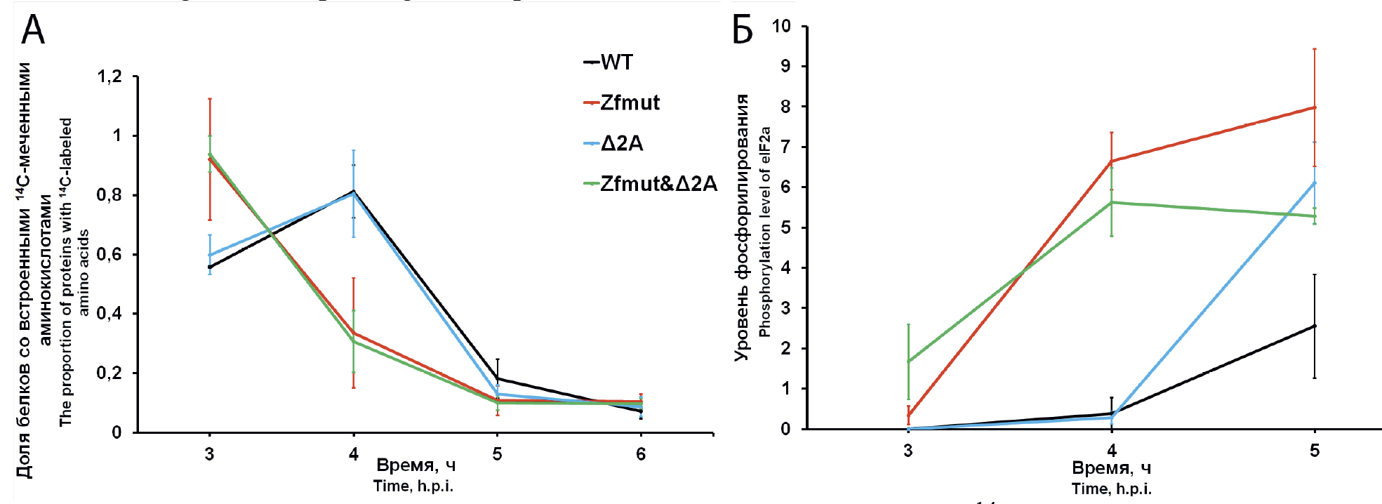 В соответствующих парах WT/Δ2A и Zfmut/Zfmut&Δ2A отсутствовала разница в характере изменения трансляционной активности с течением инфекции, а также в кинетике этого изменения. Наши результаты идут вразрез с выводами, сделанным по итогам нескольких исследований [21, 34].