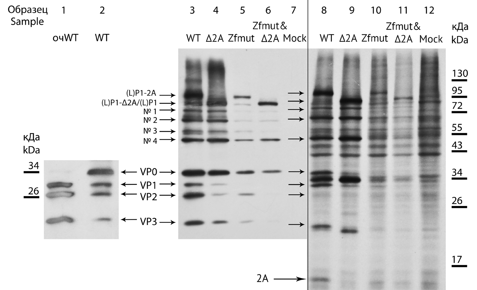 Materials and methods. Mutant variants of EMCV-1 were obtained to study the properties of L and 2A viral proteins: Zfmut, which has a defective L; Δ2A encoding a partially deleted 2A; Zfmut&Δ2A containing mutations in both proteins. Translational processes in infected cells were studied by Western-blot and the pulse method of incorporating radioactively labeled amino acids (14C) into newly synthesized proteins, followed by radioautography.