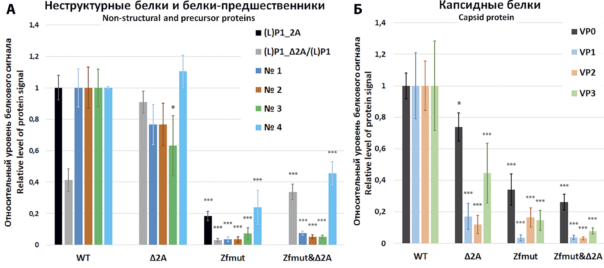 Рис. 7. Относительный уровень сигнала вирусных белков, накопленных к 4 ч после начала инфекции клеток HeLa вирусами WT, Zfmut, Δ2A и Zfmut&Δ2A. а – уровень сигнала неструктурных белков и белков-предшественников капсидных белков; б – уровень сигнала капсидных белков. Данные получены в ходе обработки результатов иммуноблоттинга лизатов зараженных клеток с использованием специфической мышиной сыворотки против белков EMCV-1 (рис. 6 а). Уровень, равный 1, соответствует уровню сигнала каждого отдельного белка вируса WT. Величину сигнала отдельных белков нормировали на сигнал у вируса WT. Обработку изображения проводили с использованием программы ImageJ. * – p < 0,05, *** – p < 0,001.