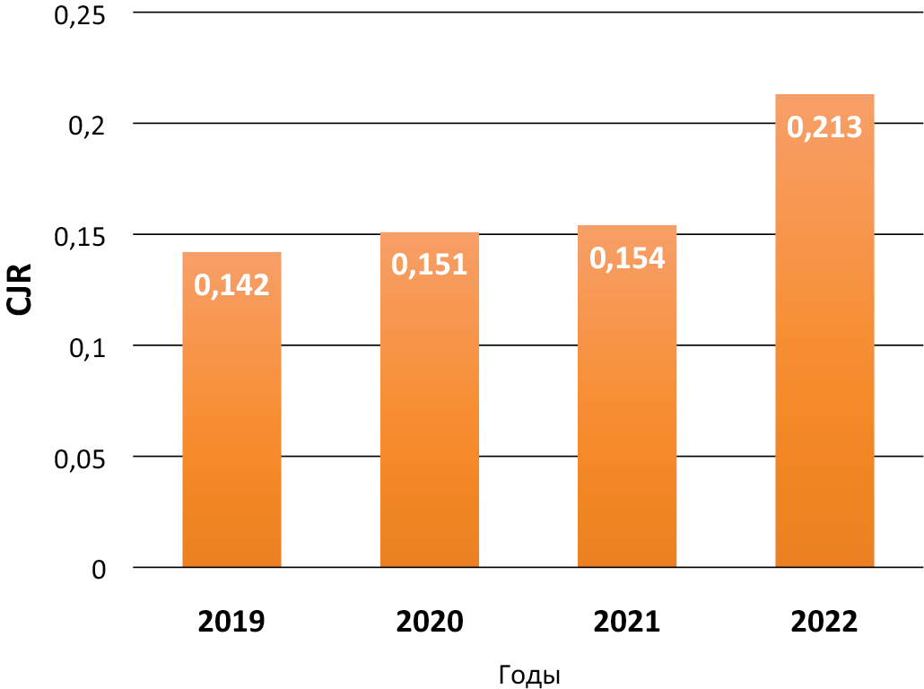2023 | 1,9 (октябрь 2023 г.) | 1,6 (2019–2022 гг.) | 47 438/830 General Medicine | 0,213 | 18 |