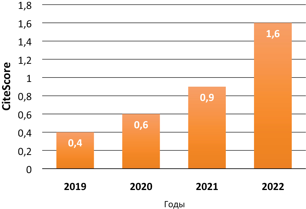 Рис. 2. Динамика показателя CiteScore в библиографической и реферативной базе данных Scopus (характеризует среднее количество цитат, полученных каждым документом, опубликованным в периодическом издании) журнала «Вопросы вирусологии».
