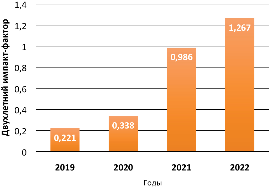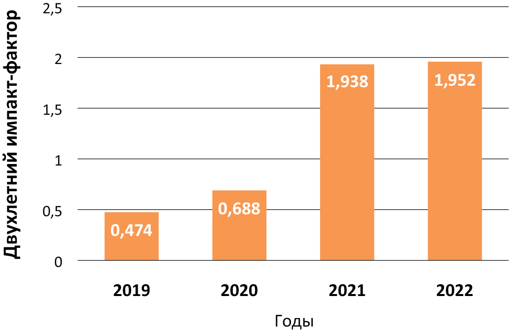 Динамика наукометрических показателей журнала отражена на рис. 1–3. Скользящий индекс цитирования CiteScore Tracker, который рассчитывается ежемесячно, на 5 октября 2023 г. составил 1.9, что свидетельствует о сохранении положительной динамики индекса цитирования (таблица). В российской базе цитирования RSCI (Russian Science Citation Index) журнал «Вопросы вирусологии» (https://elibrary.ru/title_profile.asp?id=7705) расположен в квартиле К1 и показывает уверенный рост двухлетнего индекса цитирования (рис. 4).