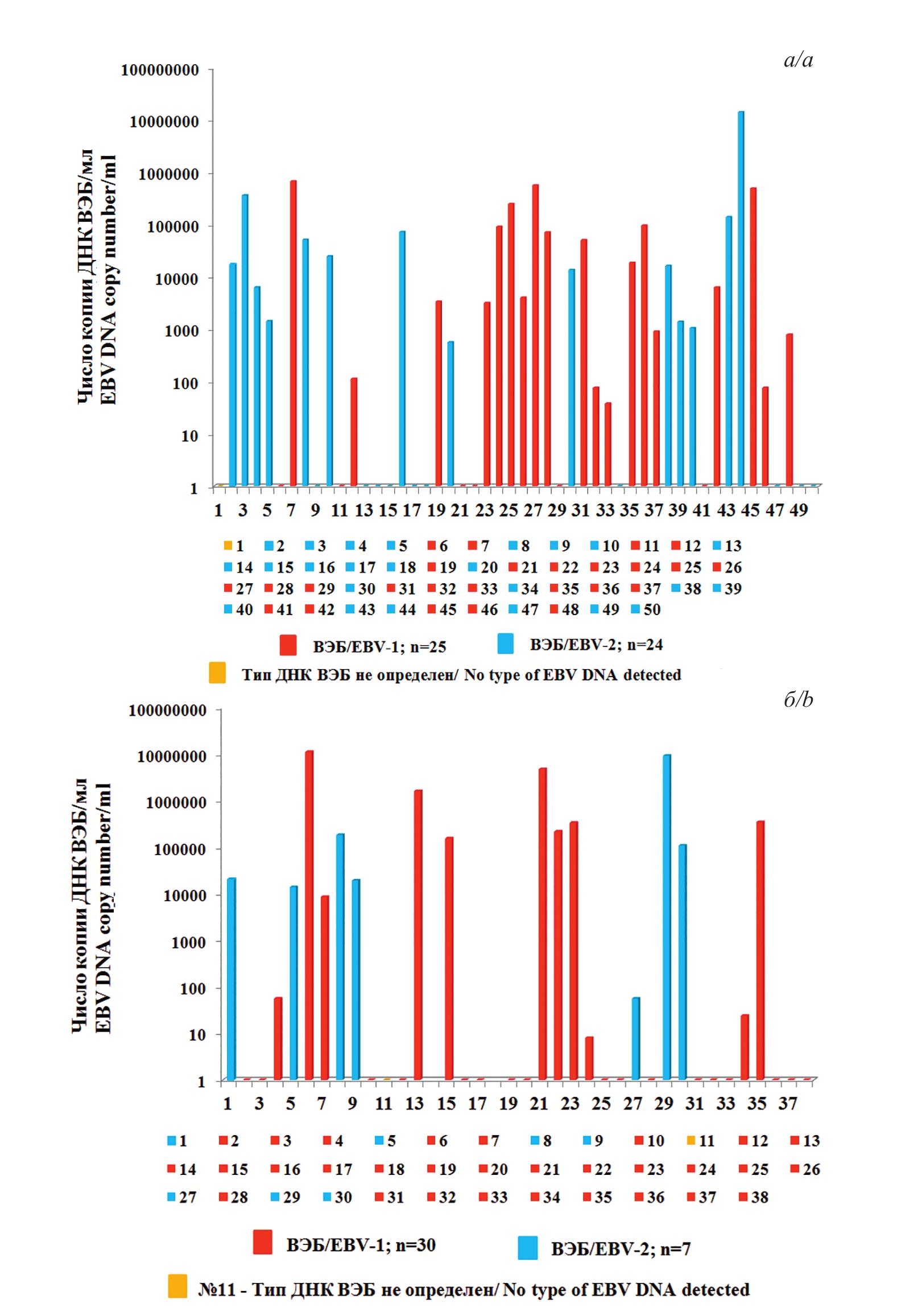 Рис. 1. Типы вируса Эпштейна–Барр и концентрация ДНК в 1 мл смыва полости рта: а – в группе калмыков; б – в группе славян.