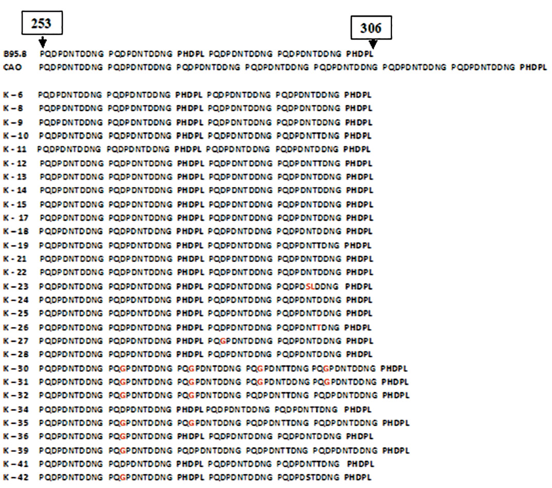 Note. B95.8, Cao are variants of the LMP1 gene; K-6–K-42, coding for LMP1 isolates from the Kalmyk group; PQDPDNTDDNG, repeat fragment of 11 amino acid residues; PHDPL, insertion of 5 amino acid residues (highlighted in bold); D→G, point (site-specific) mutations in 11 amino acid fragment (positions highlighted in red). The names of the amino acids are given according to the international nomenclature.