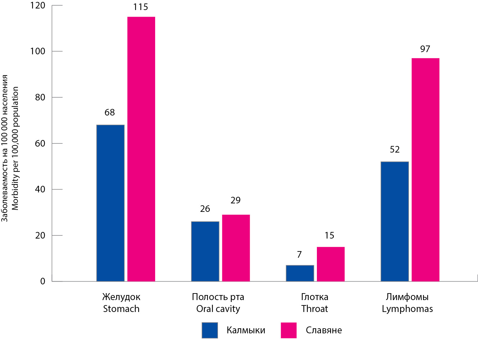 Рис. 3. Заболеваемость злокачественными опухолями, частично ассоциированными с вирусом Эпштейна–Барр, у населения Республики Калмыкия и Московской области в 2019 г.