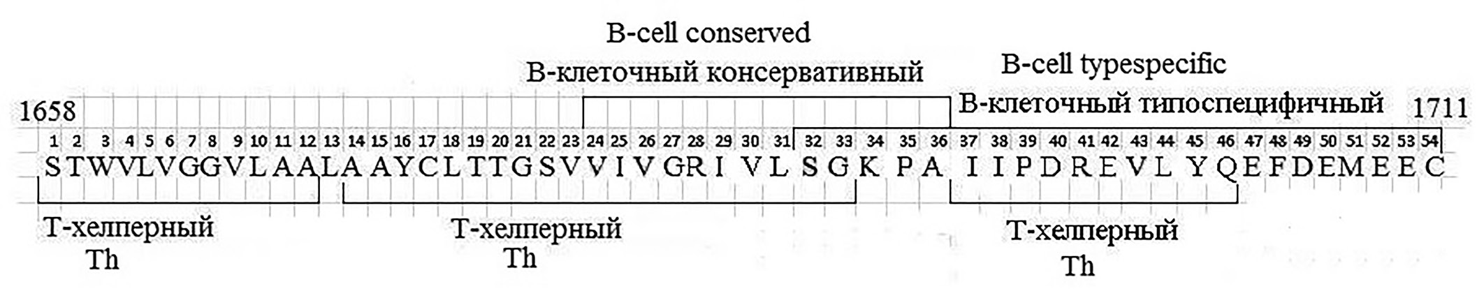 В структуре антигена NS4a, иммунореактивность фрагментов которого изучалась, выявлены В-клеточные и Т-хелперные (Тh) эпитопы. Схема их расположения приведена на рис. 1. Серединный В-эпитоп является консервативным, а С-концевой – типоспецифичным, в некоторых положениях аминокислотных остатков возможны вариации в зависимости от конкретного генотипа ВГС.
