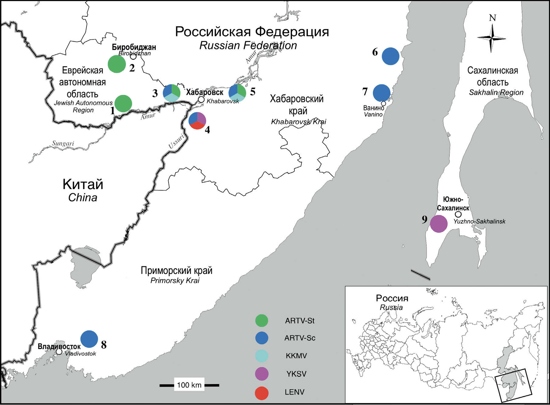 На Дальнем Востоке России в южной части Хабаровского края и Республике Саха были выявлены и идентифицированы четыре вида хантавирусов. Совместная циркуляция двух значительно различающихся вирусов Лена (LENV) и варианта ARTV-Sc вируса SWSV была обнаружена в популяциях средней бурозубки (S. caecutiens) в Хабаровском крае и Республике Саха [7, 14]. На основе получения и анализа полноразмерных геномов выдвинута гипотеза, что хантавирусы ALTV и LENV возникли в ходе эволюции в результате межвидового перехода предкового хантавируса летучих мышей к насекомоядным и его последующего распространения среди бурозубок рода Sorex на территории Евразии [8]. Второй генетически различающийся вариант вируса SWSV, ранее называемый ARTV-St, был обнаружен среди S. tundrensis на юге Хабаровского края [14]. В Хабаровском крае и Республике Саха среди плоскочерепных бурозубок установлена циркуляция вируса KKMV, а в Хабаровском крае в таежных бурозубках (S. isodon) был найден вирус Yakeshi (YKSV), ранее выявленный в том же носителе на приграничной территории Китая [11, 14, 15].