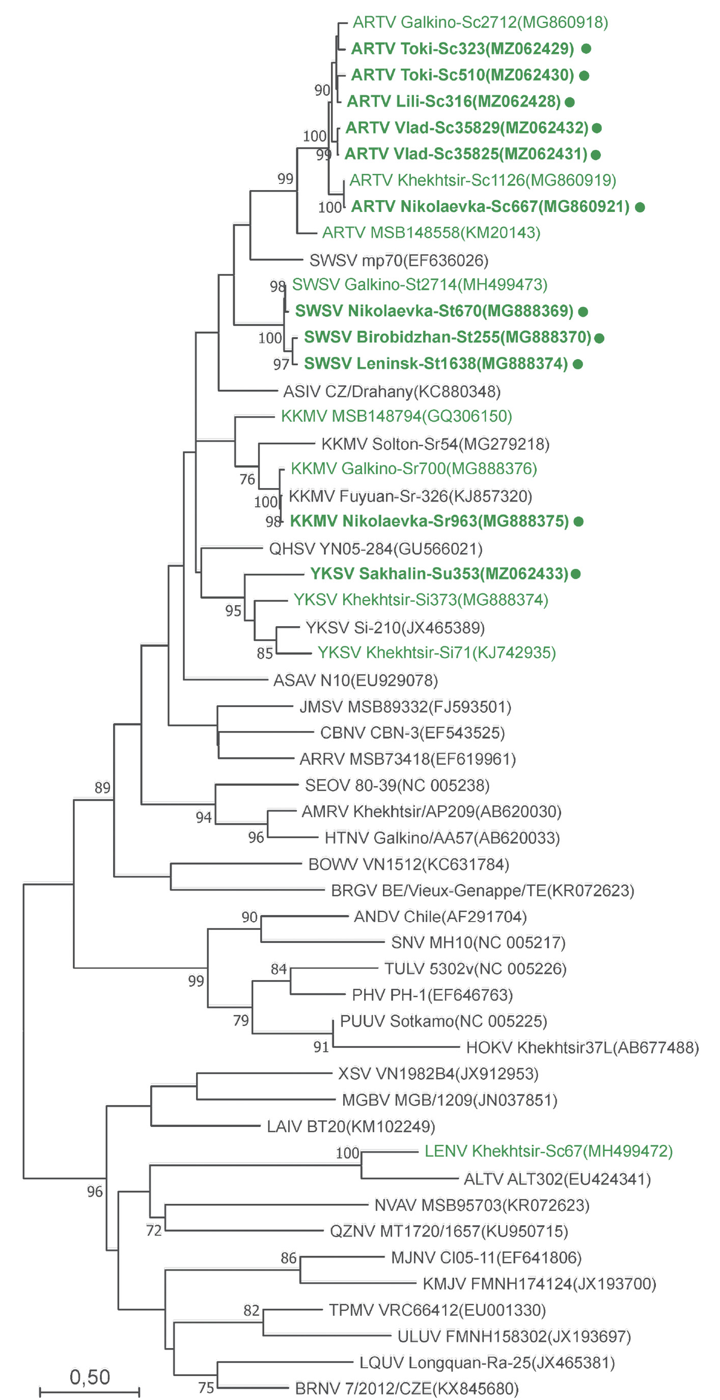 Fig. 2. Phylogenetic tree of Sorex-borne hantaviruses (colored in green) identified in the Far East of Russia in relationship to strains from insectivores, rodents and bats from other regions of the world. Tree, generated by maximum-likelihood method, was based on the L segment sequences, under the best-fit GTR + I + G model with 1000 bootstrap replicates. Strains from this study are shown in bold lettering and circles.