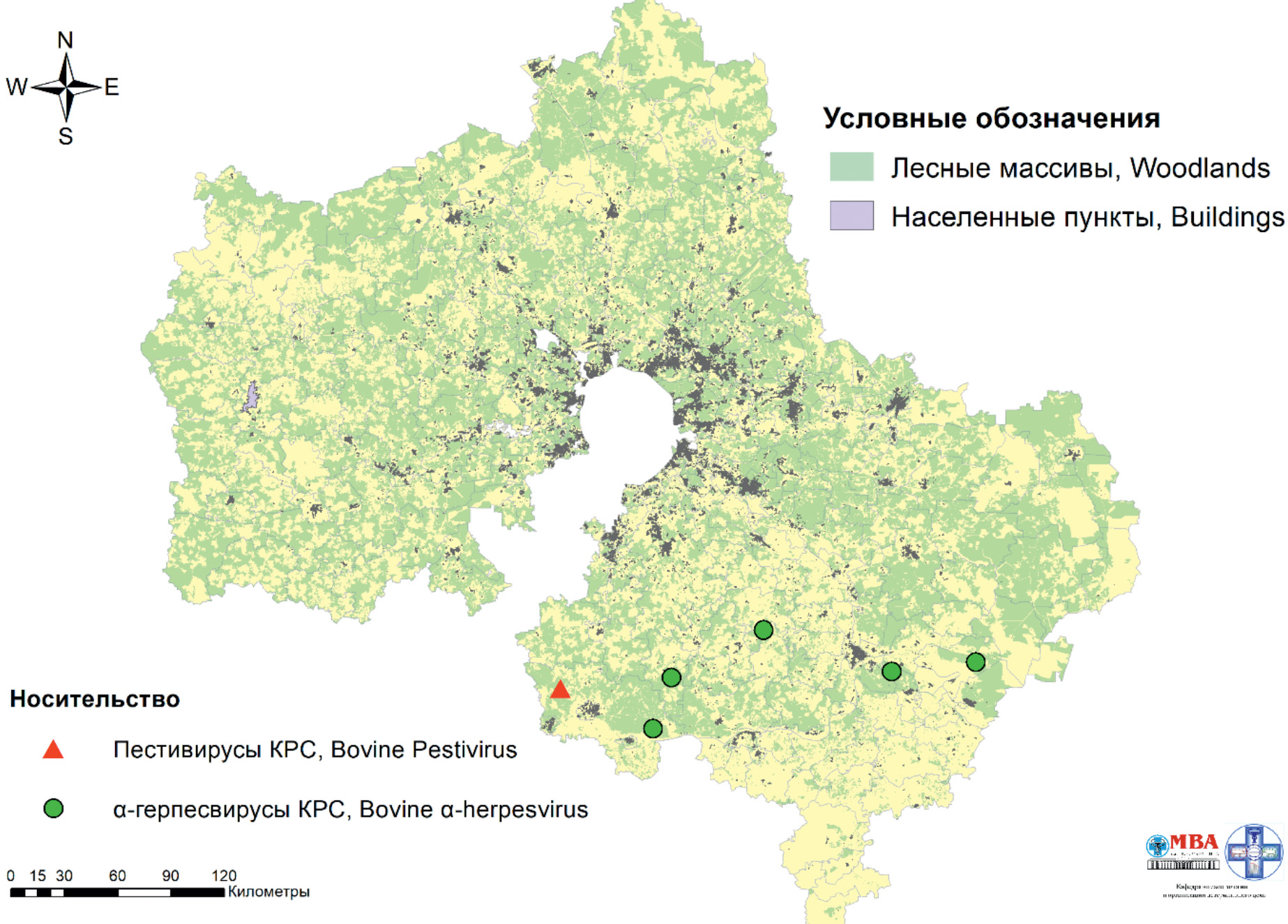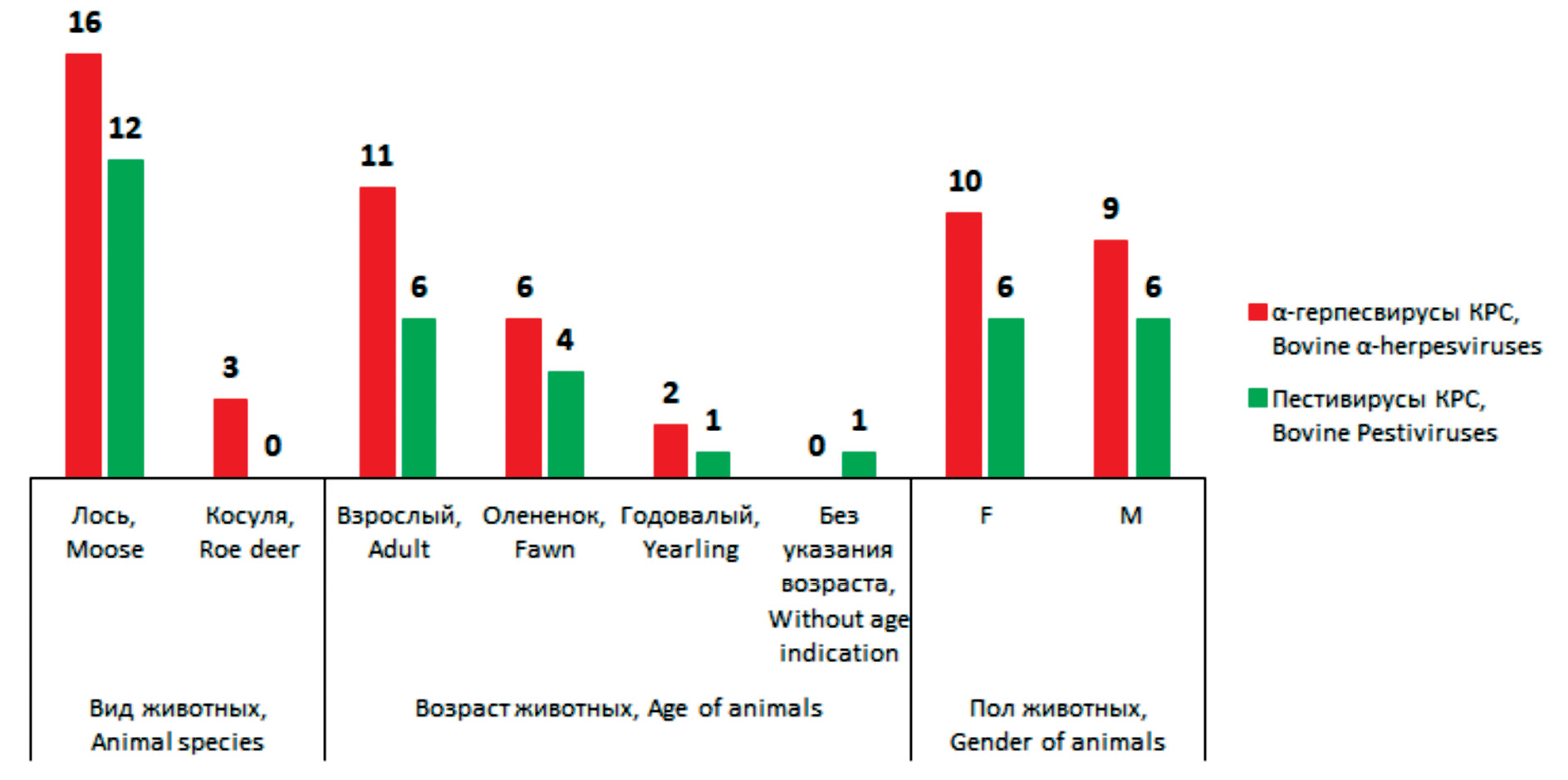 Из 124 парнокопытных, добытых на территории Московской области, пробы сыворотки крови отобраны только у 41 животного, в том числе от 36 лосей и 5 косуль. Трудности с отбором были связаны с большим промежутком времени между гибелью животного и проведённым отбором проб, а также с низкой температурой воздуха в зимний период, что приводило к частичному гемолизу крови, полученному незначительному объёму сыворотки и, как следствие, определёнными трудностями при её исследовании в реакции нейтрализации. В образцах сыворотки 19 животных (16 лосей, 3 косули) были детектированы антитела к α-герпесвирусам КРС. Антитела к пестивирусам КРС детектированы в сыворотке крови 12 лосей. При этом антитела к обеим группам возбудителей определены в сыворотке крови 8 лосей.