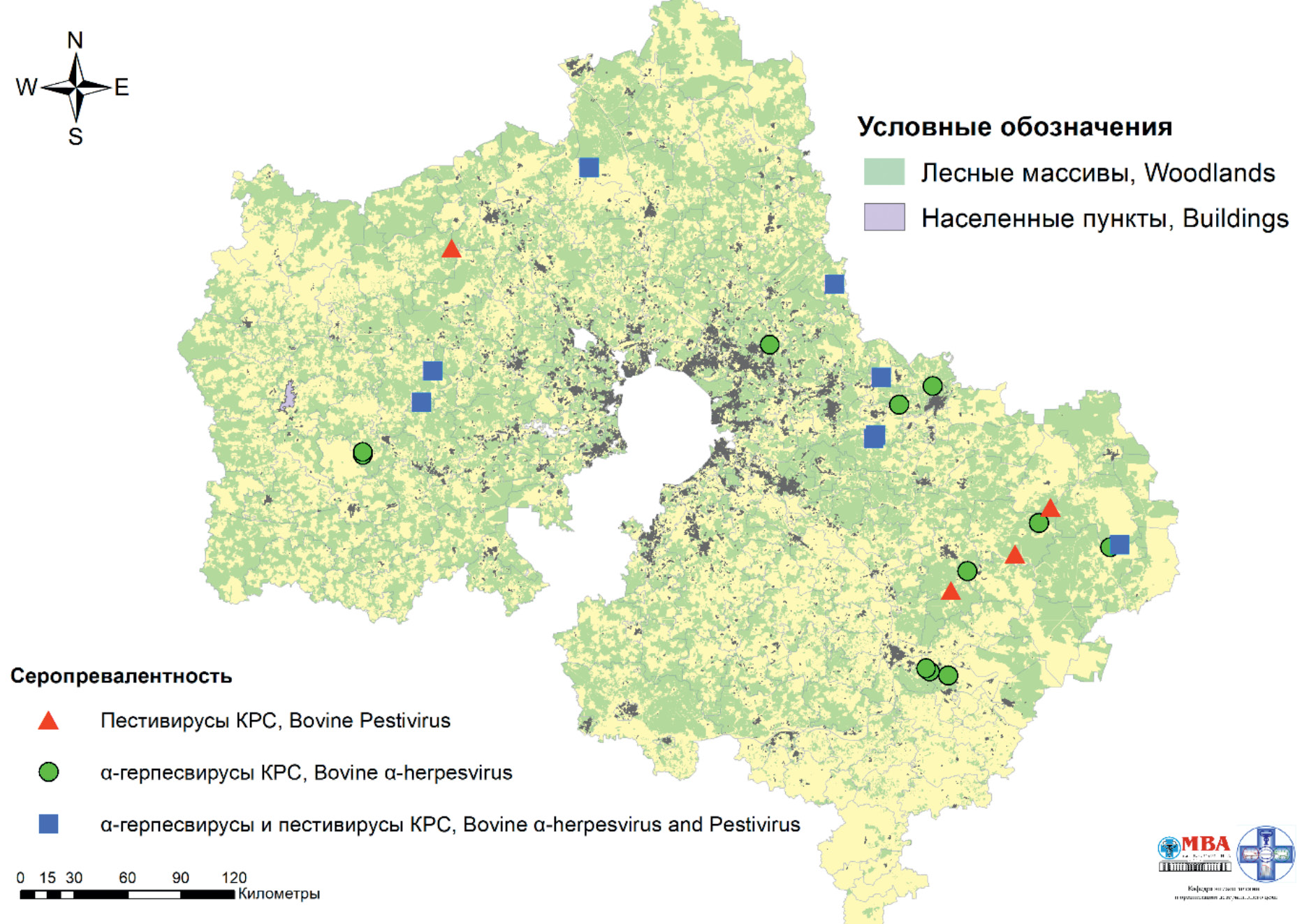 К сожалению, только по результатам серологических исследований, несмотря на факт отсутствия вакцинации, мы не можем точно установить носительство дикими парнокопытными Московской области возбудителя ИРТ КРС – герпесвируса КРС 1-го типа. Детектированные нами в 46% исследованных проб антитела могли выработаться в организме в ответ на инфицирование любым α-герпесвирусом КРС. Для точной дифференцировки J. Thiry и соавт. в своей работе рекомендует проводить идентификацию предварительно изолированного из патологического материала возбудителя в реакции иммунофлуоресценции с моноклональными антителами [12]. Но в нашей работе изоляция возбудителей из патологического материала не проводилась.