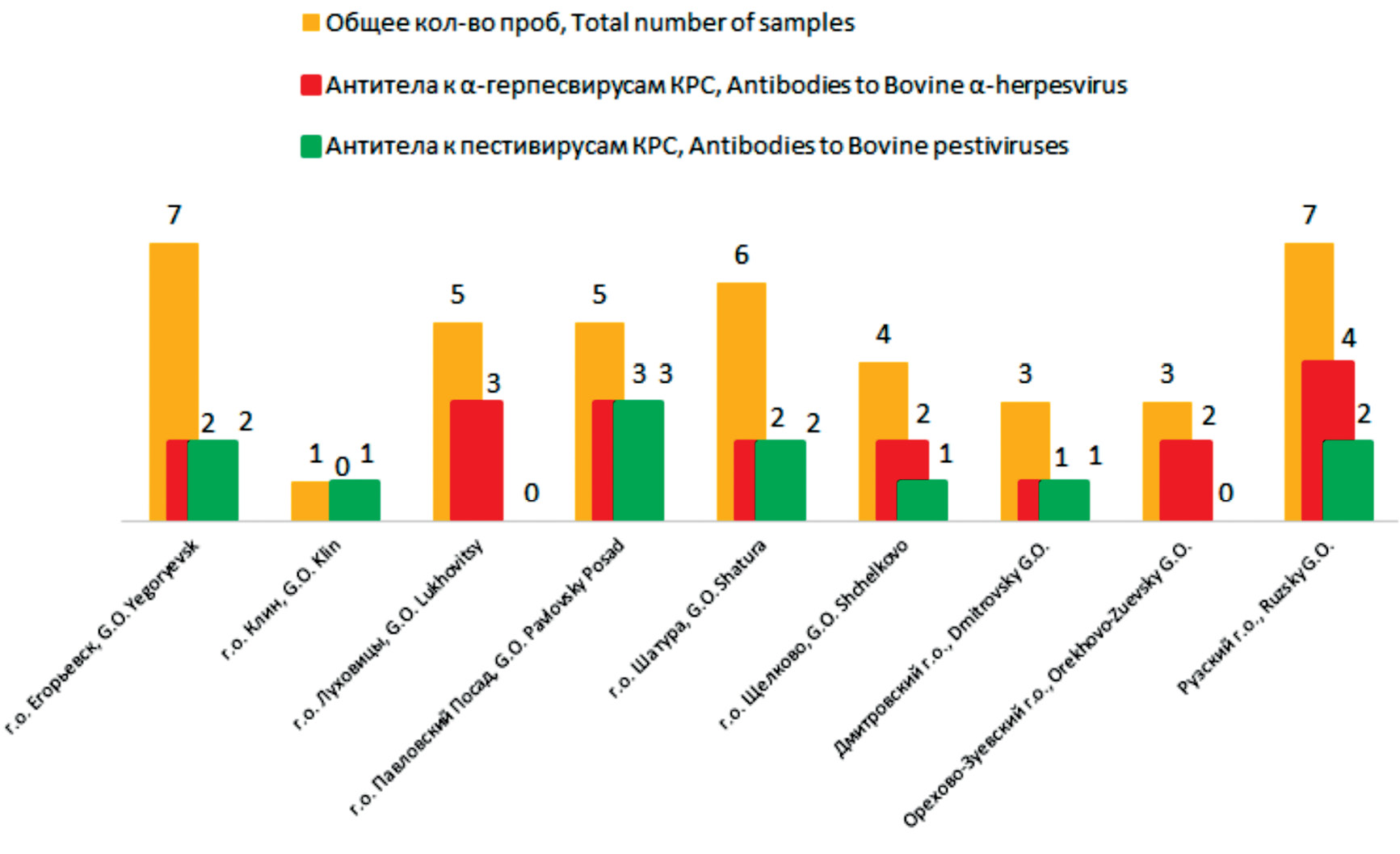 Рис. 3. Регионы Московской области, где проведён отбор проб сыворотки крови и сравнение общего количества исследованных проб и проб, в которых детектированы антитела к α-герпесвирусам КРС и пестивирусам КРС. Fig. 3. Territories of the Moscow Region where serum samples were obtained and the comparison of total number of samples studied and samples in which antibodies to cattle α-herpesviruses and cattle pestiviruses were detected.