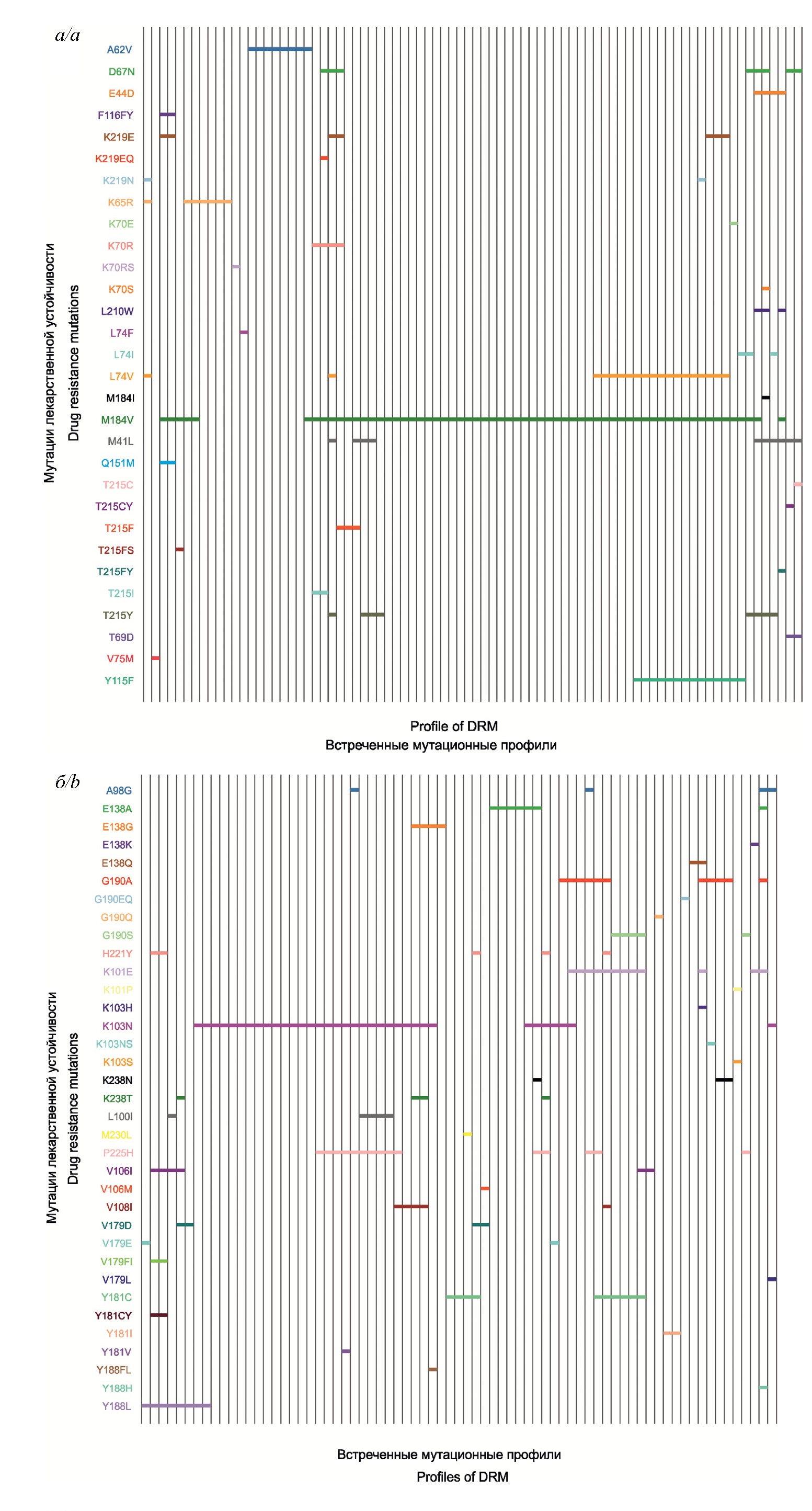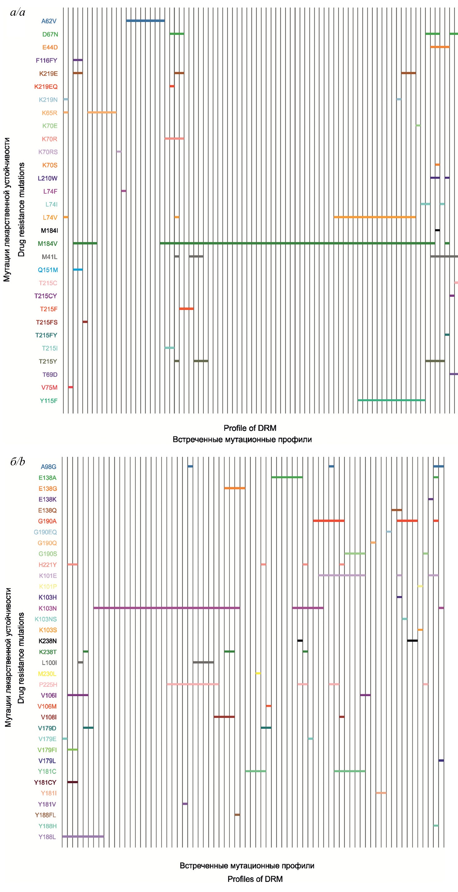 Fig. 3. Results of the study of multiple mutational profiles by constructing line diagrams: a – for NRTI resistance mutations; b – for NNRTI resistance mutations.