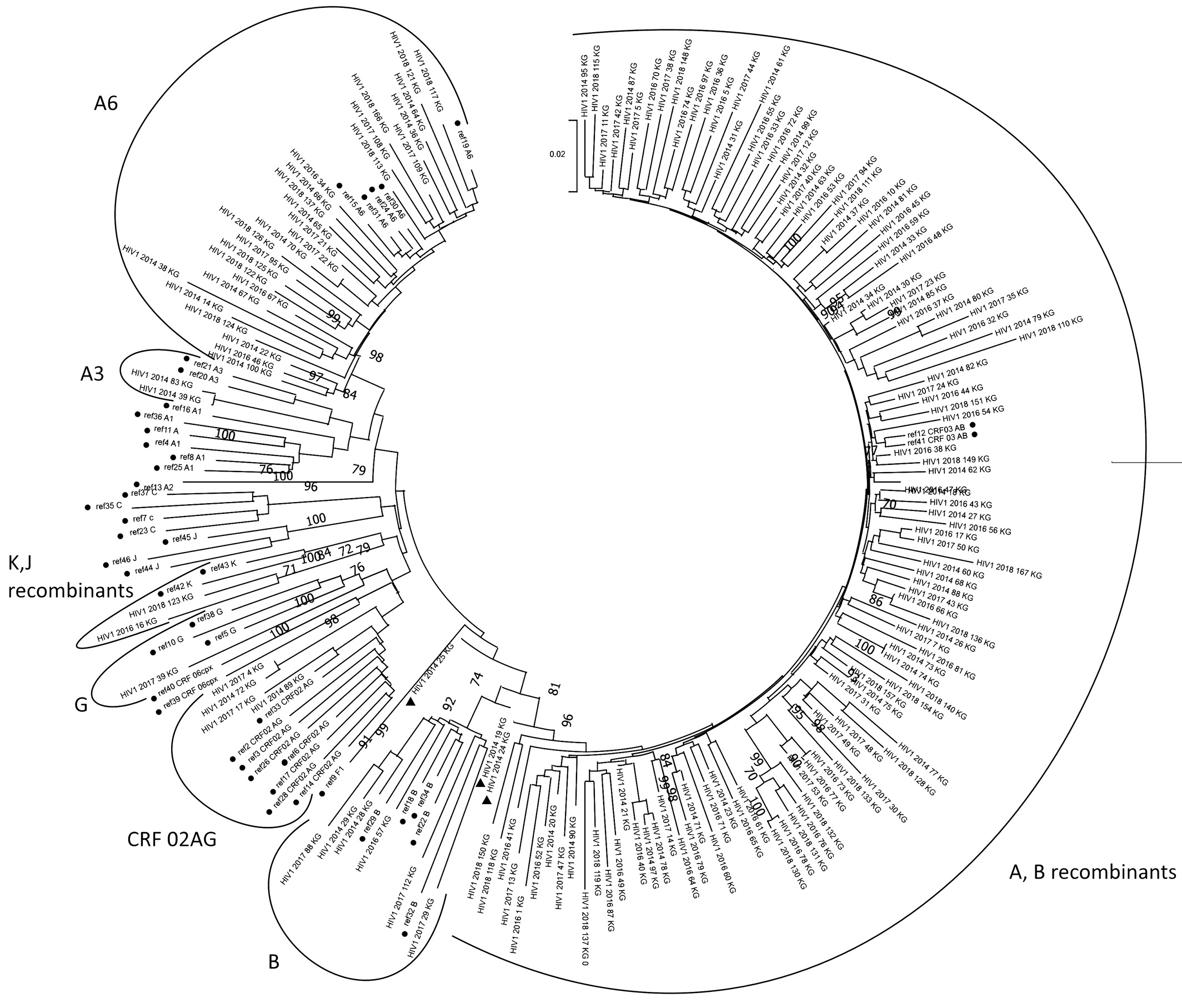 Fig. 1. Results of phylogenetic analysis using the Neighbor Joining algorithm. • – reference sequences (table 2); ▲ – recombinant forms between subtypes A and B, not clustered with other recombinants of this group.