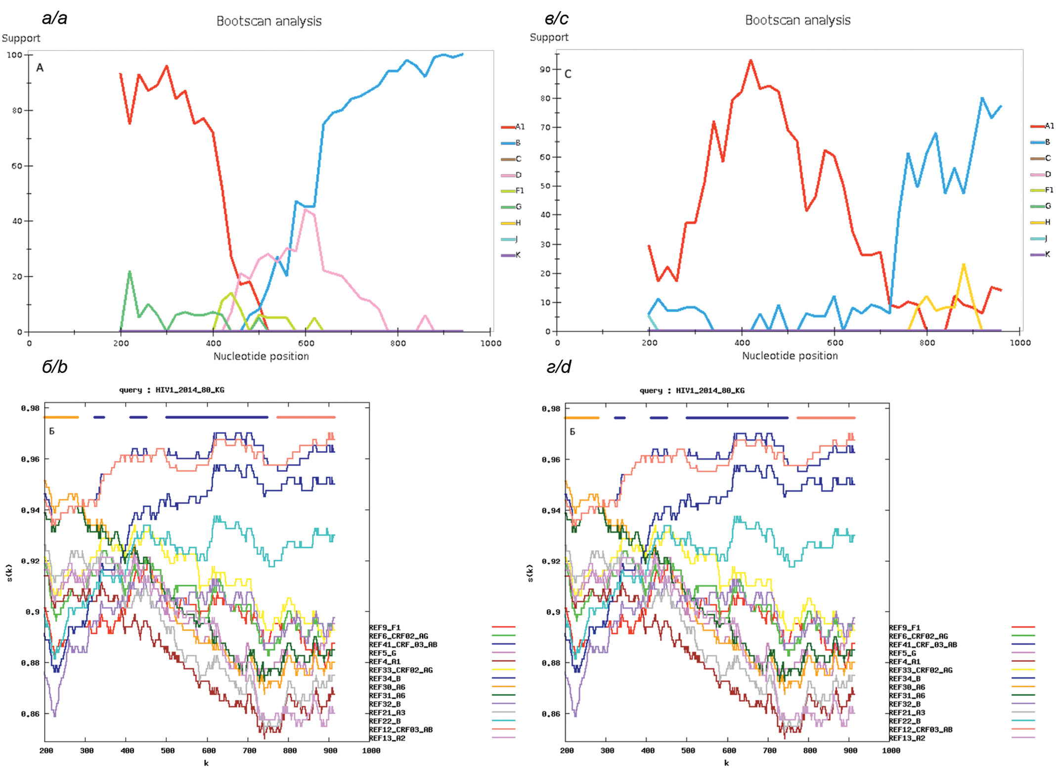 Fig. 2. Comparative recombination analysis of samples 2014_80 (CRF03_AB) and 2014_19 (A + B recombinant) in Rega HIV Subtyping Tool v3.0 [21] and Recombinant Identification Program (https://www.hiv.lanl.gov/content/sequence/RIP/RIP.html) a – sample 2014_80 in Rega HIV Subtyping Tool v3.0; b – sample 2014_80 in the Recombinant Identification Program; c – sample 2014_19 in Rega HIV Subtyping Tool v3.0; d – sample 2014_19 in the Recombinant Identification Program [25].