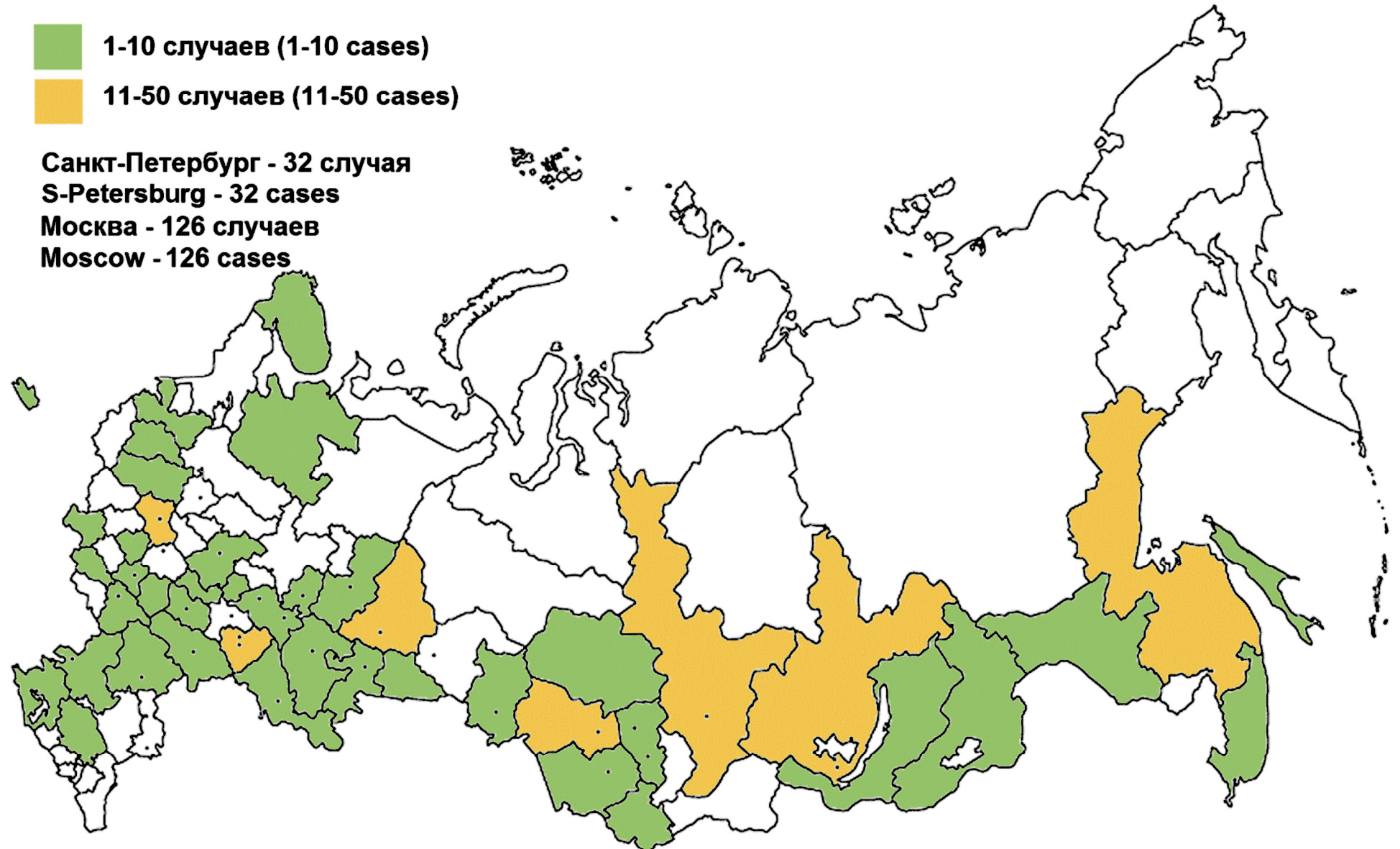 Fig. 1. Distribution of cases of dengue fever in the Russian Federation in 2019 (according Federal Service for Surveillance on Consumer Rights Protection and Human Wellbeing).