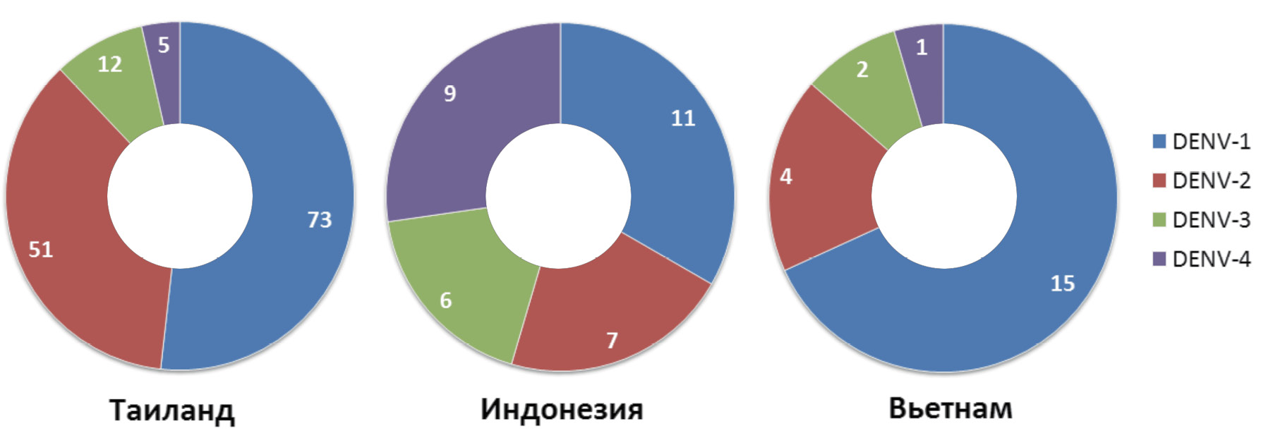 The etiological role of the DENV-1 serotype was identified in 49.5% of cases, while in different hyperendemic countries, its proportion ranged from 33.3% to 68.0%; all the 4 serotypes in different ratios were detected in countries with 10 and more hospitalized patients (Fig. 3).