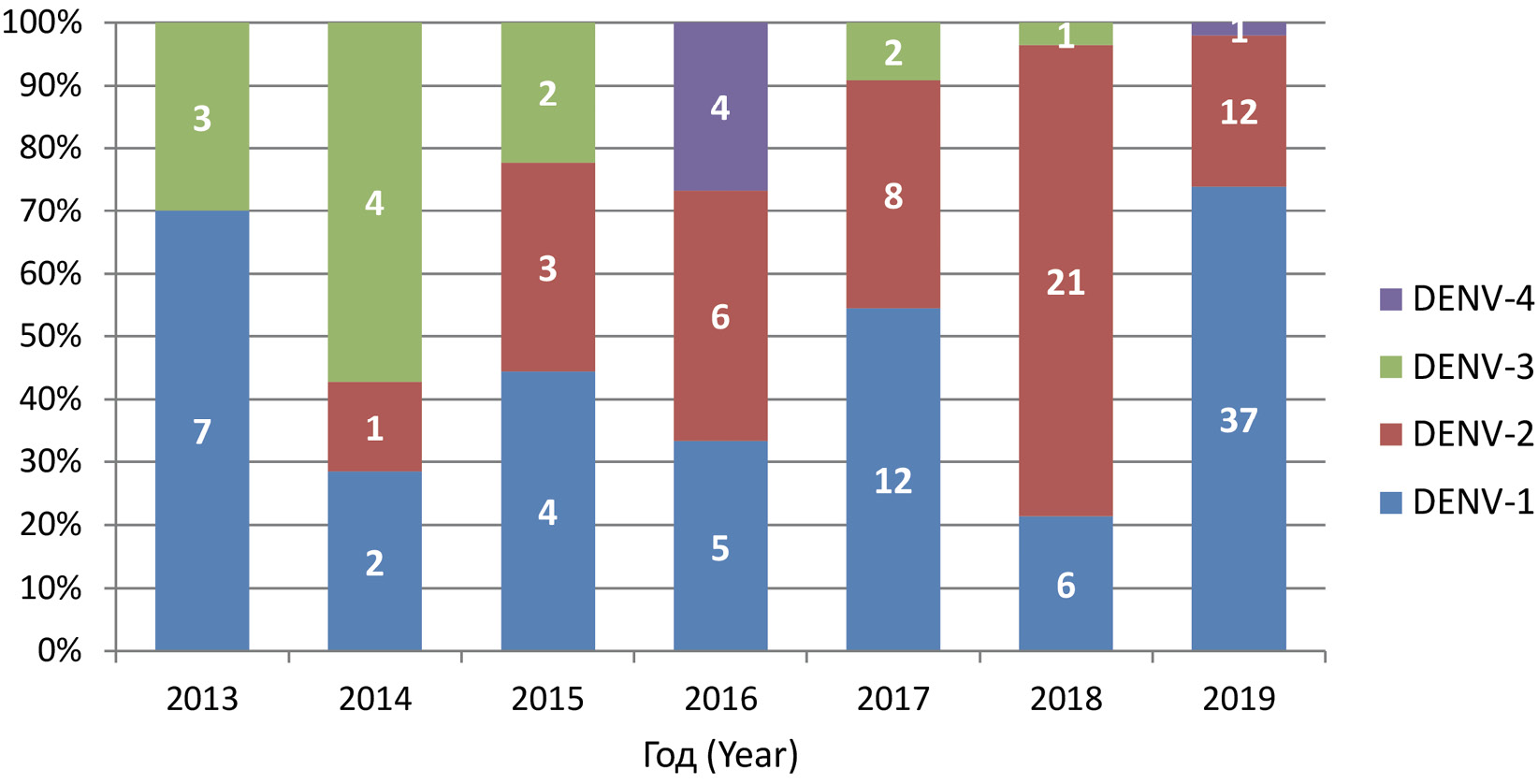Plasma samples collected from 246 patients were tested using the reverse transcription polymerase chain reaction (RT-PCR), and the virus serotype was identified in samples from 244 patients: DENV-1 – 121 (49.5%), DENV-2 – 77 (31.5%), DENV-3 – 30 (12.3%), DENV-4 – 15 (6.1%); one patient had coinfection with DENV-1 and DENV-2. Two patients, who were hospitalized on the 4th day (DHF) and 8th day (DF) of the disease, had a negative PCR test result. During different years, the ratio between the variants varied significantly, demonstrating the dominance of DENV-1 or DENV-2.