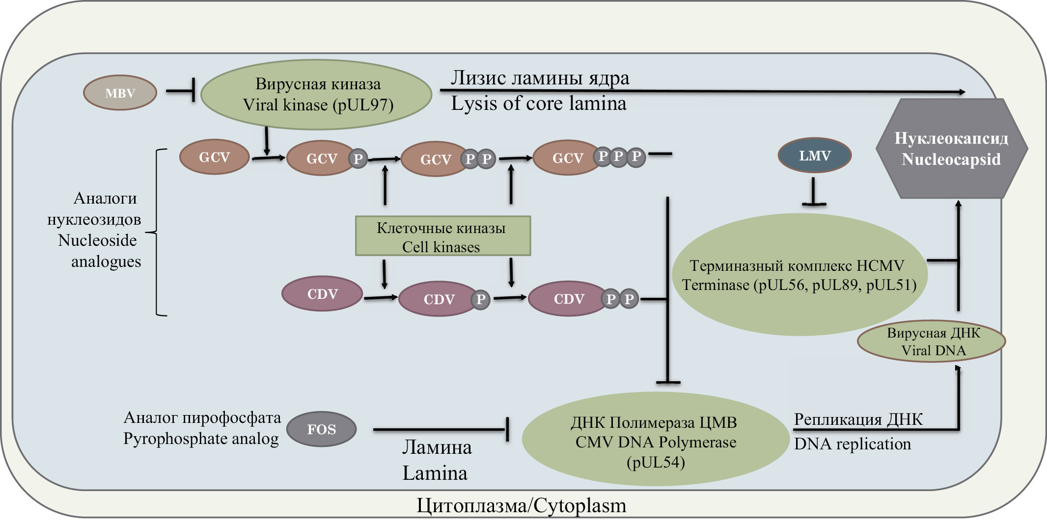 Подход к противовирусной терапии включает в себя применение лекарственных средств, напрямую или опосредованно подавляющих вирусную репродукцию, чаще всего путём блокировки процесса репликации вирусного генома. На сегодняшний день известно несколько препаратов, способных подавить размножение β-герпесвирусов. В первую очередь это вещества, влияющие на работу вирусной ДНК-полимеразы [10], такие как ацикловир, ганцикловир и их пролекарства с большей биодоступностью – валацикловир и валганцикловир. Данные лекарственные средства являются аналогами нуклеозидов [11] и зарегистрированы для клинического применения на территории Российской Федерации. Как в России, так и во всём мире лечение инфекций, вызываемых ЦМВ, ВГЧ-6 и ВГЧ-7, проводится в большинстве случаев с помощью ганцикловира и валганцикловира [12]. По сравнению с α-герпесвирусами (вирусами простого герпеса 1-го и 2-го типа и вирусом варицелла-зостер), сродство вирусных ферментов β-герпесвирусов (ЦМВ, ВГЧ-6 и ВГЧ-7) с ацикловиром и другими тимидинкиназозависимыми противогерпетическими агентами выражено в меньшей степени [12], на чём и основан подход к терапии. Согласно существующим рекомендациям, профилактика ЦМВ-инфекции производится ганцикловиром и валганцикловиром, в то время как рекомендаций для проведения профилактики инфекций, вызванных ВГЧ-6 и ВГЧ-7, на данный момент не существует [13].