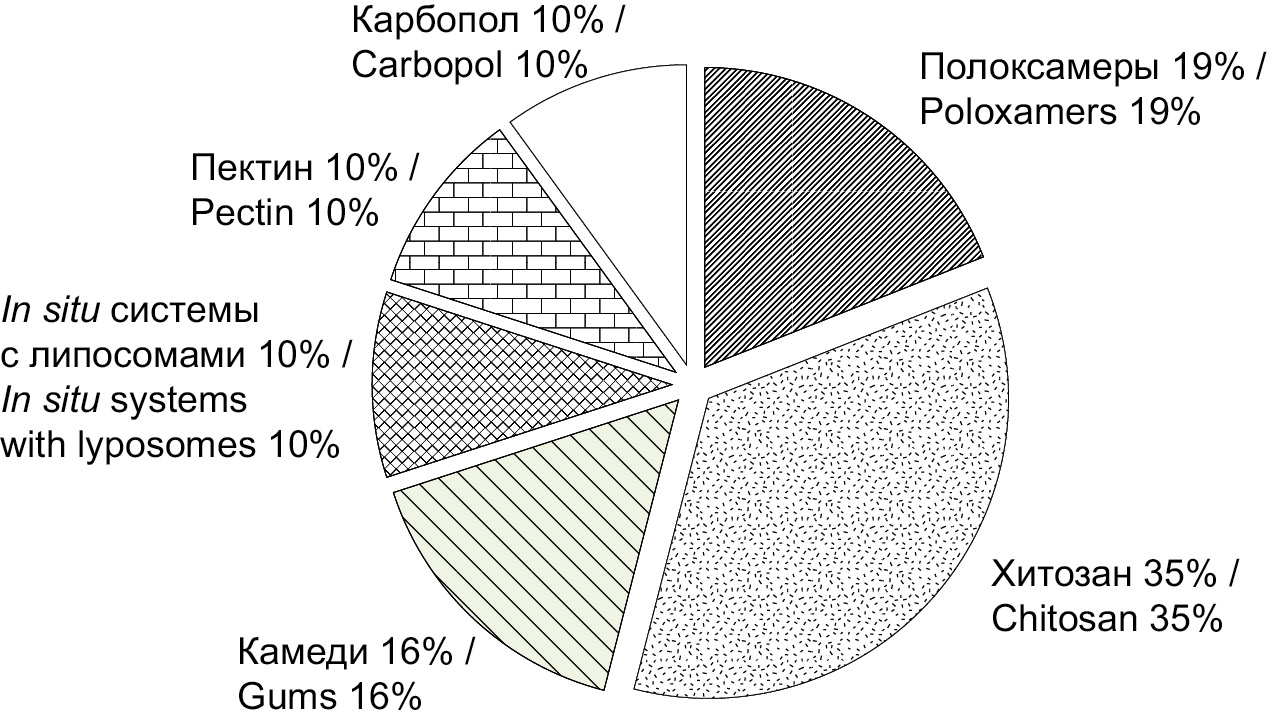 The analysis of the PubMed database of medical publications for the 2000–2022 timespan, using such keywords as intranasal in situ vaccine, intranasal in situ peptide, intranasal in situ protein, was used to estimate the usage frequency for different polymers in development of in situ IBD delivery systems (Figure). Natural polymers – chitosan (35%) and various gums (16%) as well as synthetic poloxamers (19%) were most popular. The main characteristics of polymers are discussed below.