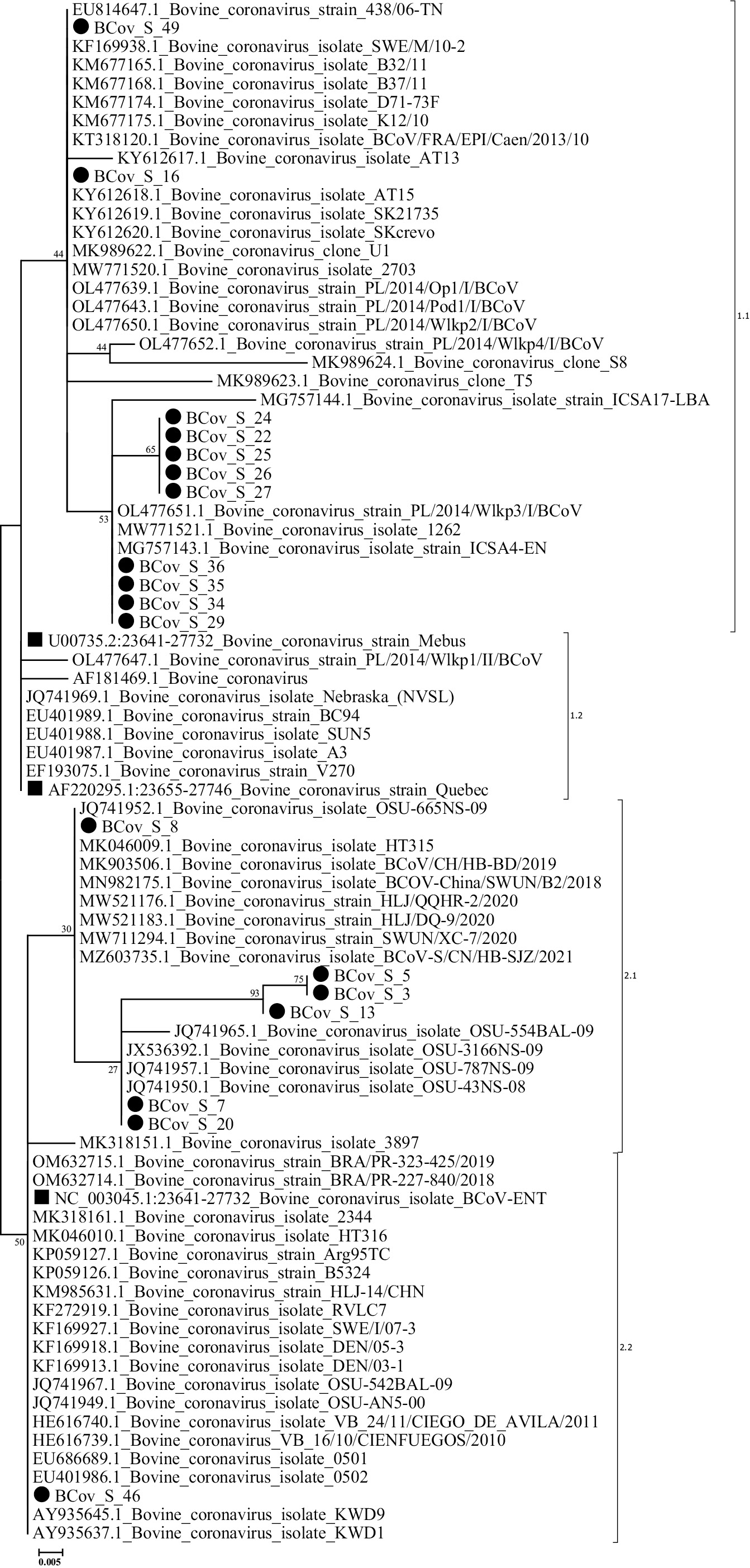 Fig. 1. Phylogenetic dendrogram based on the bovine coronavirus glycoprotein S gene sequence region. Bootstrap support is indicated near each node of the dendrogram. The strains obtained in this work are marked with a black circle (●). Reference strains are marked with a black square (■). Strains from the GenBank database present in fig. 1 and 2 are marked with a white triangle (∆). For strains from the GenBank database, the name and identification number are indicated. The clade numbers are indicated to the right of the square brackets.