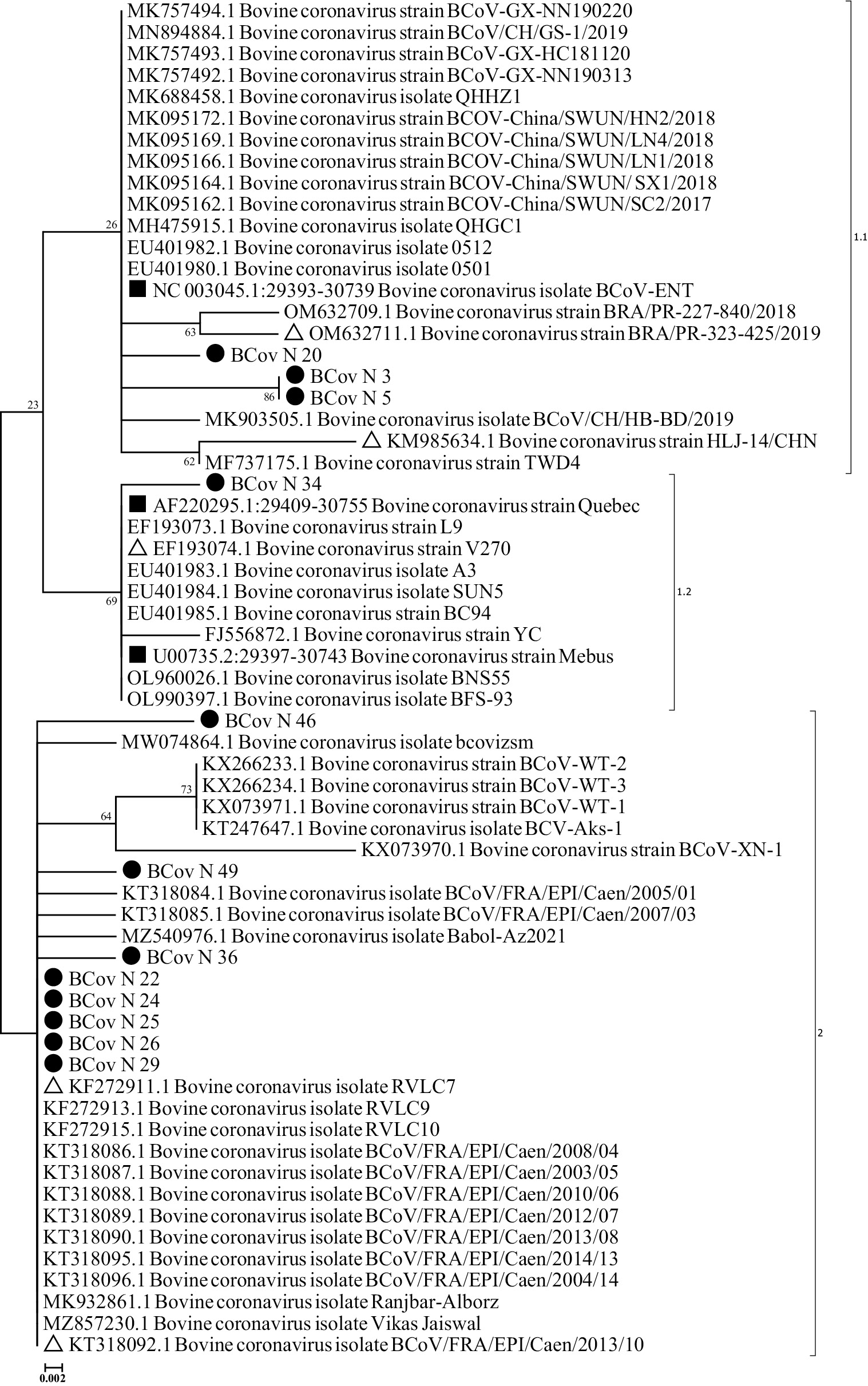 Fig. 2. Phylogenetic dendrogram based on the bovine coronavirus nucleocapsid N gene sequence region. Bootstrap support is indicated near each node of the dendrogram. The strains obtained in this work are marked with a black circle (●). Reference strains are marked with a black square (■). Strains from the GenBank database present in fig. 1 and 2 are marked with a white triangle (∆). For strains from the GenBank database, the name and identification number are indicated. The clade numbers are indicated to the right of the square brackets.