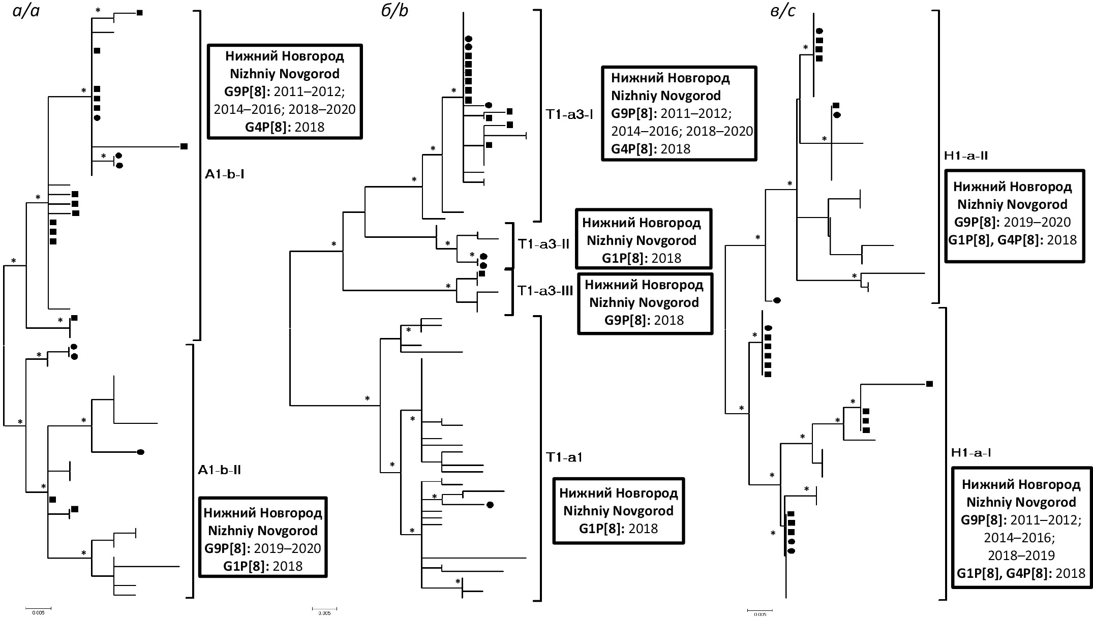 RVs with the A1 genotype, which belong to two sublineages (А1-b-I and A1-b-II) of phylogenetic lineage A1-b, were identified in Nizhny Novgorod during the studied period. Most of the Nizhny Novgorod strains with the G9P[8] genotype, which were isolated throughout the studied period (86.7%), as well as the related RVs from Hungary, Germany, Italy, and Egypt, which had G1P[8], G4P[8], G9P[8], and G12P[8] genotypes, belonged to sublineage A1-b-I. The Nizhny Novgorod strains showed a 97.8–99.9% nucleotide sequence identity within the sublineage. Sublineage A1-b-I was also represented by 3 strains with the G4P[8] genotype from Nizhny Novgorod. Sublineage A1-b-II included 2 G9P[8] strains from Nizhny Novgorod, which were isolated in 2019–2020; the nucleotide sequence identity between them was 99.6%. The most closely related strains were RVA isolates with G9P[8] and G12P[8] genotypes from Pakistan and Paraguay. The difference between these strains and representatives of sublineage A1-b-I was 6.3–8.1%. The above sublineage also included 3 Nizhny Novgorod strains with the G1P[8] genotype [8].