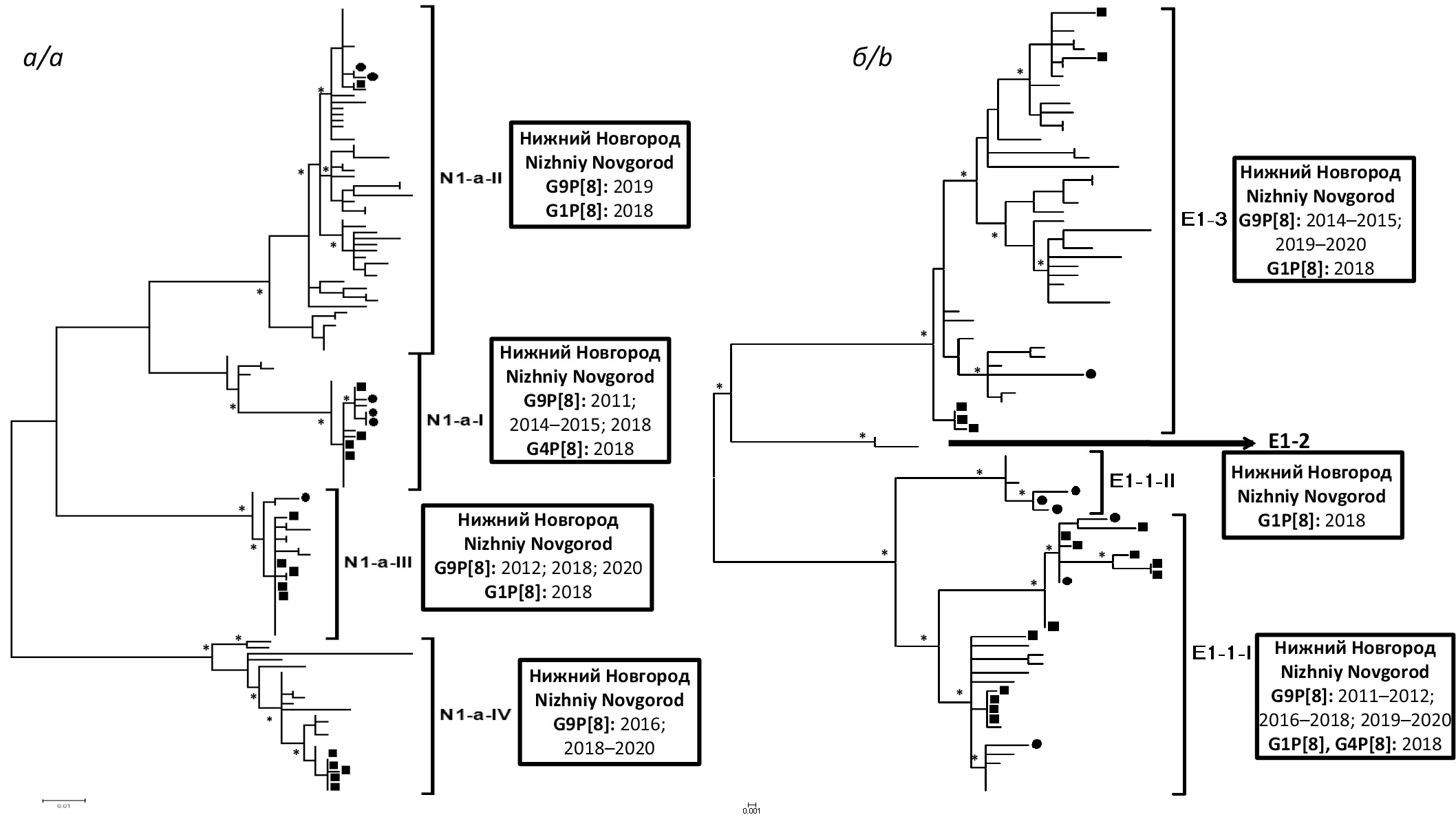Sublineage N1-a-I included 4 strains from Nizhny Novgorod, which were isolated in 2018–2019. The isolates with G1P[8] and G4P[8] genotypes from Nizhny Novgorod, Novosibirsk, and Omsk were most closely related to them. Sublineage N1-a-II included one Nizhny Novgorod strain with the G9P[8] genotype, which was isolated in 2019, as well as related RVs from Nizhny Novgorod, the United States, Italy, Japan, and Novosibirsk, which had G1P[8] and G3P[8] genotypes. Five G9P[8] strains from Nizhny Novgorod, which were isolated in 2012 and 2020, represented sublineage N1-a-III. The related isolates were from Hungary, Japan, and Novosibirsk, all of them having the G1P[8] genotype. The above sublineage also included one Nizhny Novgorod G1P[8] strain (2018). Sublineage N1-a-IV included 5 Nizhny Novgorod strains, which were isolated in 2016 and 2019, as well as the related G4P[8] RVs from Novosibirsk and Ethiopia, which were detected in 2012 and 2016.