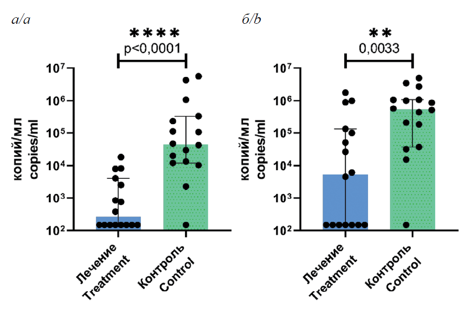 Вирусная нагрузка значимо снижалась у животных экспериментальной группы относительно контроля на 4,65 и 5,72 lg копий/мл в тканях лёгких (рис. 1 а) и носовой полости (рис. 1 б) соответственно.