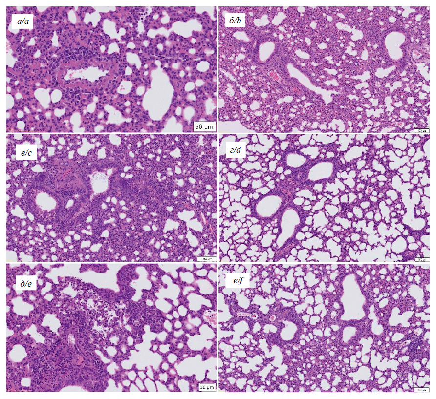 Другим показателем эффективности противовирусного препарата является снижение тяжести поражения тканей лёгкого инфицированного животного. Для изучения патоморфологических изменений тканей лёгких мышей контрольной и экспериментальной группы были проанализированы гистологические препараты, полученные от животных на пике инфекции. В результате исследования выявили ряд патологических изменений: дистелектаз, диффузные кровоизлияния, единичные лимфоцитарные инфильтраты (рис. 2).